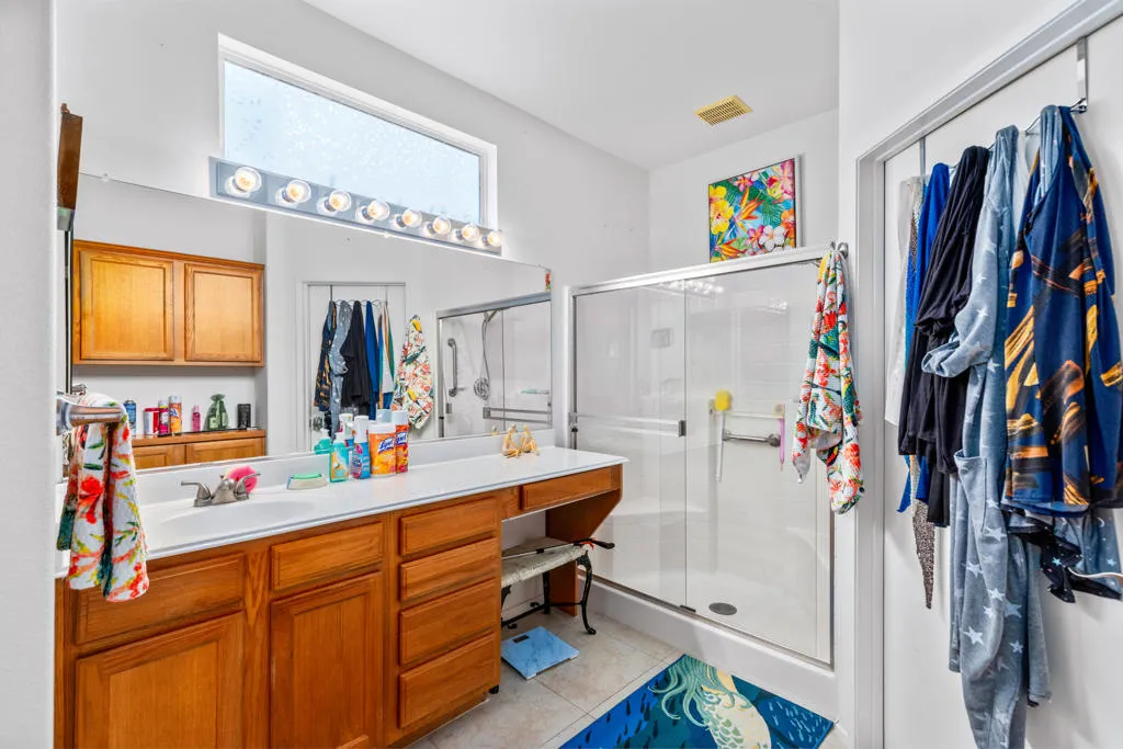 South facing EXTENDED LANAI model with 3 bedrooms, 2 full baths, upgraded quartz kitchen counter, newer appliances and oak cabinets. Both bedrooms are bright and clean with newer higher-end carpeting. Primary bedroom has a walk in closet. Guest bathroom has been beautifully remodeled. Inside laundry room. Newer Lennox air conditioning system. New sliding glass door off the eating area. Entering the gracious backyard with Alumawood cover on patio, you will see beautiful citrus trees and aboveground mineral spa in excellent condition, There is room for a pool. Very private. Owner will include 2019 E-Z-GO Lithium golf cart hardly ever used...for the right price! Garage has plenty of storage room, and a high-end workshop area, all with space for 2 cars and a golf cart. This home is located close to the Lakeview Clubhouse.