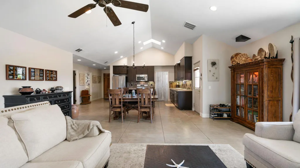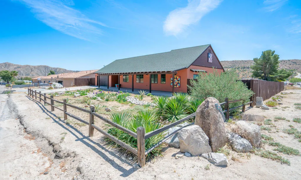Breathtaking views surround this Morongo Valley retreat situated on almost one-third-acres. Modern open living meets farm/mountain charm enveloped by gorgeous gardens lovingly cultivated by the current owner. From espalier fruit trees, to lush ornamentals, your very own Shangri-La is waiting for you right here in the San Bernardino mountains. Inside, the great room is the central focus. With vaulted ceilings and ample light, it features all the modern amenities you expect in a home built in 2004 including ample recessed and accent lighting. The kitchen features a brand new stainless steel range and dishwasher. The refrigerator stays as does the washer dryer. The primary bedroom includes an ensuite bathroom and over-sized walk-in closet, while two additional bedrooms offer versatility for workspace, hobbies, or guests. Special Features: 2-car over-sized garage with 147 sqft storage or workshop. Stubbed-out for gas fireplace in the great room. RV gate with parking for your home on wheels. 4 ton a/c system. Natural gas metered to the house. Dual energy sources , gas and electricity outlets for dryer and range. Underground utilities. Garage has dual electrical panels. 380 amperage exterior and 215 amperage inside. 8 outlets located around the perimeter of the house. Front and back drip irrigation. Fire hydrant a few yards away. Mini-orchard featuring 10 fruit trees, 3 apple, pear, 2 cherry, pear, plum apricot, peach and nectarine.
