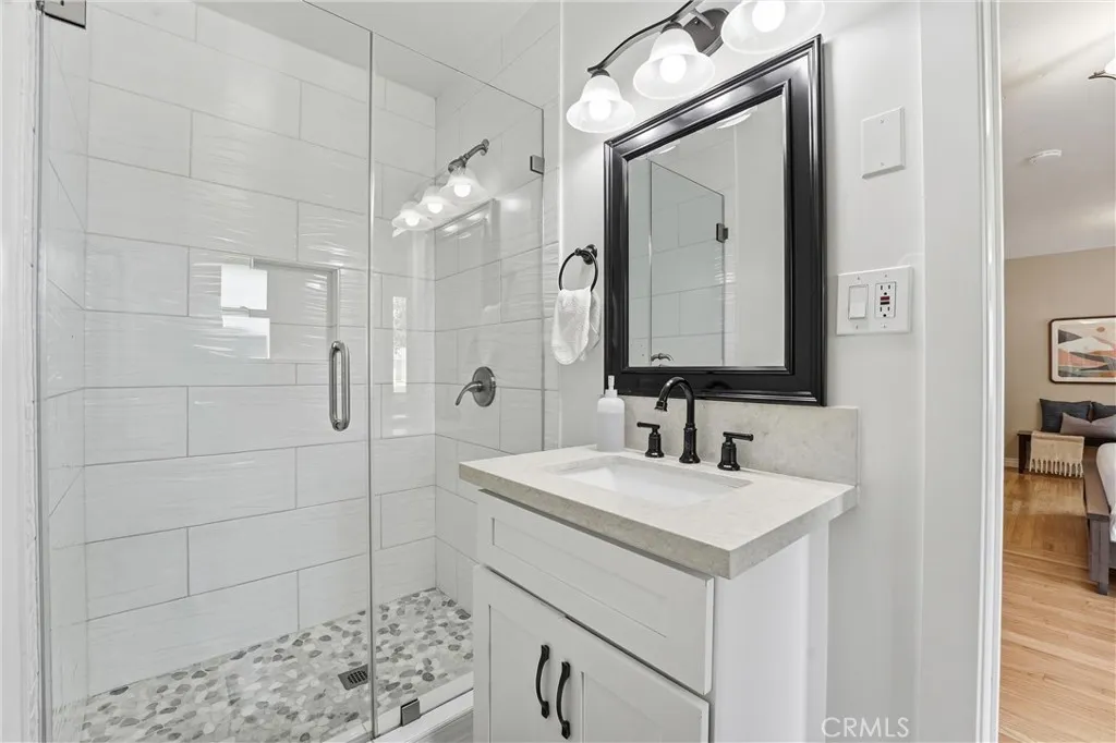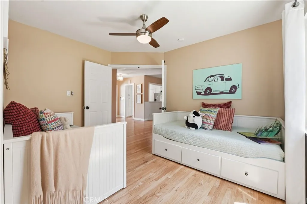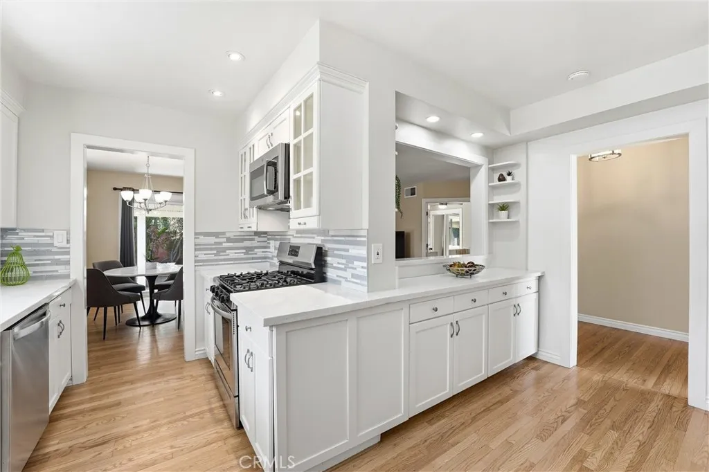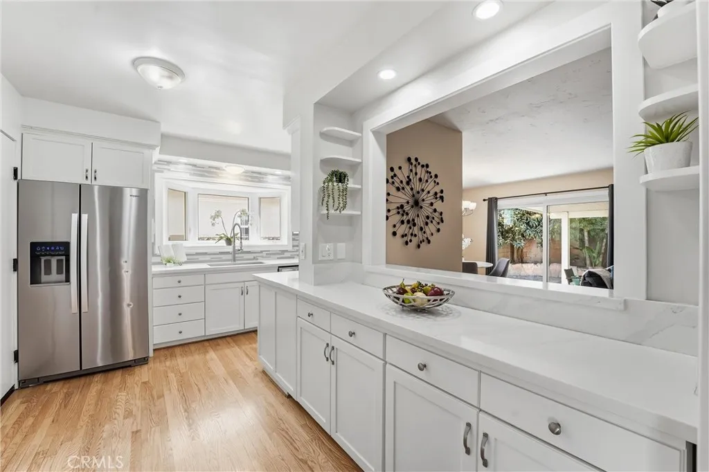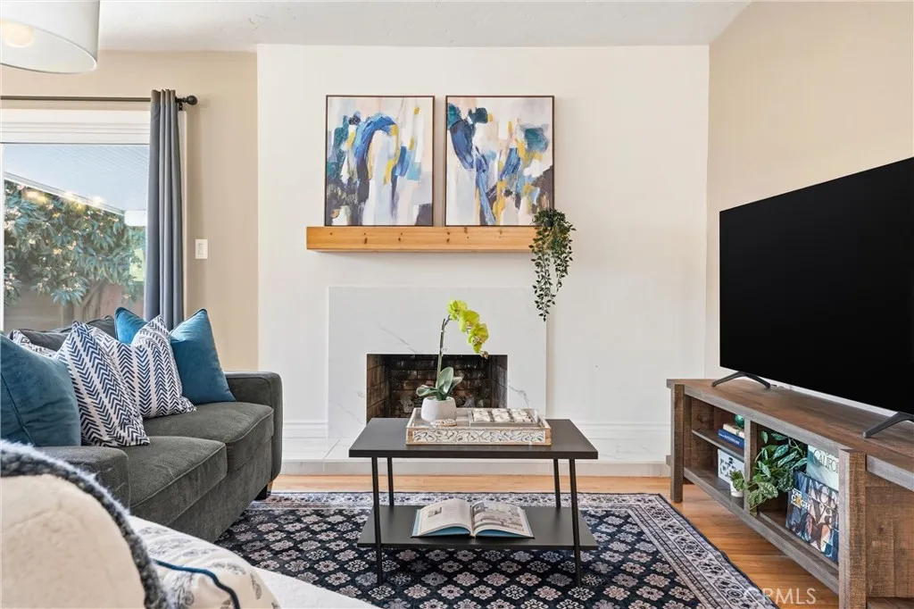 Beautifully upgraded single-story home located on a charming tree-lined street in Fullerton. This turnkey property offers excellent curb appeal with exterior paint, lush landscaping, and mature fruit trees.The bright open-concept layout features hardwood flooring throughout, 5-inch baseboards, vinyl windows and sliding doors, recessed lighting, contemporary fixtures, ceiling fans, and central air conditioning. The stunning kitchen showcases white cabinetry, quartz countertops, a glass tile backsplash, and stainless steel appliances—perfect for both everyday living and entertaining. The spacious living and dining areas are filled with natural light, highlighted by a beautiful quartz-surround fireplace that serves as the focal point of the home. All three bedrooms are generously sized with mirrored closet doors, including an expansive primary suite (approx. 20’ x 12’) with dual closets and a private retreat area. Both bathrooms have been tastefully upgraded with custom tile, frameless glass shower enclosures, and modern vanities and finishes.Enjoy the California indoor-outdoor lifestyle in the private backyard featuring a covered patio, custom flagstone hardscape. Located within the highly regarded Fullerton Joint Union High School District, with convenient access to the 91 and 5 freeways and just minutes from Downtown Fullerton’s shopping, dining, and transportation.