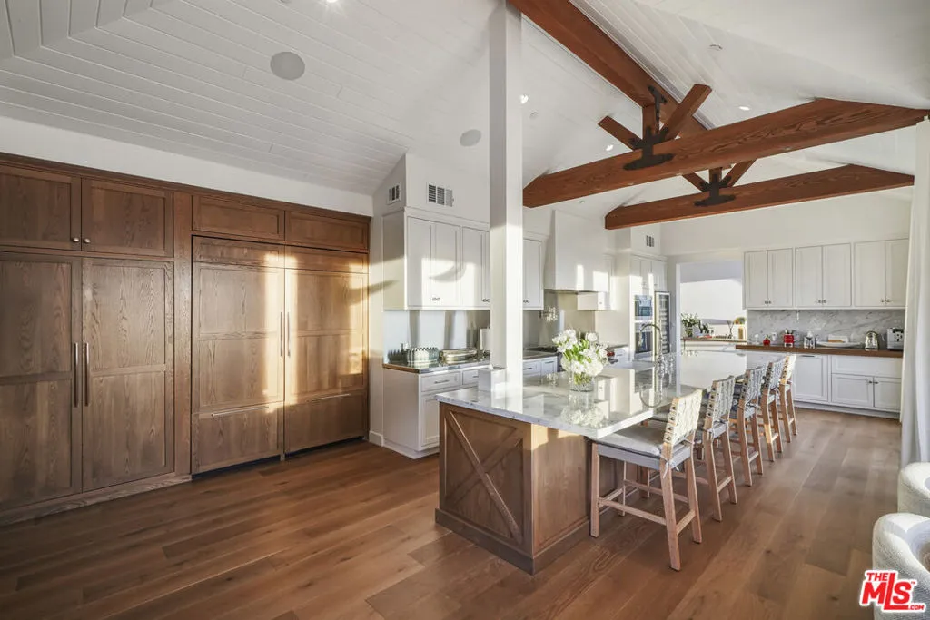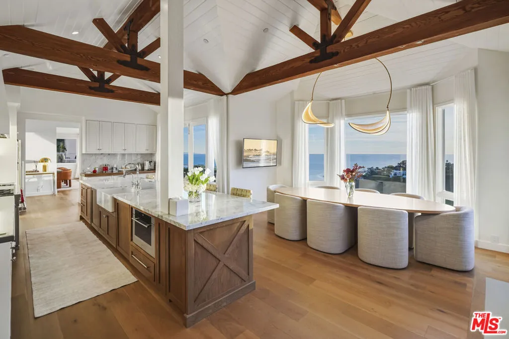 A pristinely redone and truly breathtaking Malibu "Serra Retreat" estate with commanding ocean views spanning the Malibu Pier, Surfrider Beach, and the endless whitewater coastline, securely positioned behind the 24-hour guard gates of Serra Retreat, Malibu's most prestigious private enclave. A future equestrian estate awaiting vision and execution, this extraordinary offering presents a rare opportunity to create a world-class compound with a riding ring, guest residence, staff quarters, and resort-style amenities (buyer to conduct their own due diligence). Completely remodeled, the home is an elegant fusion of farmhouse-inspired exterior architecture and a richly layered warm-modern interior, embodying refined luxury, quiet sophistication, and one of the most commanding coastal vantage points in all of Serra Retreat. Every detail has been thoughtfully curated to elevate both form and function, creating a residence that feels timeless, substantial, and undeniably glamorous. Privately set on 3.3 acres across two parcels, the estate offers immediate luxury paired with exceptional future potential. The second parcel allows for the addition of a pool, tennis court, guest home, and equestrian riding ring (buyer to conduct their own due diligence), while directly bordering miles of protected hiking, biking, and horseback riding trails; an extraordinary blend of oceanfront drama and serene natural beauty.The residence spans approximately 5,548 square feet and features four ensuite bedrooms and four-and-a-half baths. A long, private gated drive leads to a formal entry where dramatic ocean views immediately captivate, framed by soaring vaulted ceilings, exposed wood beams, bespoke detailing, and expansive walls of glass capturing the coastline from nearly every room. From the moment of arrival, uninterrupted sightlines draw the eye outward to the Pacific, with sunlight dancing across refined interiors.A full-length ocean-view balcony extends across the home, offering a front-row seat to glowing sunsets, rolling surf, and the iconic Malibu Pier below. The main level is masterfully designed for both grand entertaining and intimate daily living. A sun-drenched living room features vaulted wood-beam ceilings, a sculptural metal fireplace, and inviting seating perfectly positioned to enjoy the coastline and evening skies. A full bar, formal dining room, and multiple lounging areas appear to float above the ocean, creating seamless flow throughout. The chef's kitchen is both striking and highly functional, appointed with custom white-oak cabinetry, high-end stainless steel appliances, an expansive center island, fireplace, and walk-in pantry ideal for refined entertaining or quiet mornings overlooking the sea. Completing the main level are a guest bedroom with a second-story loft and additional sleeping area, a well-appointed laundry room, and a private dry sauna.A wide custom staircase leads to the lower level, where a generous entertainment lounge transitions into the primary suite; a luxurious private retreat bathed in natural light and breathtaking coastal views. Floor-to-ceiling windows frame the horizon, while the spa-inspired bath features a soaking tub, separate shower, and dual vanities. The suite opens directly to a private outdoor hot tub, perfectly positioned to capture Malibu's legendary sunsets in complete privacy. Two additional ensuite bedrooms provide beautifully appointed accommodations for family and guests. Additional features include an oversized three-car garage, parking for five or more vehicles, and two graded pads ideal for future enhancements. Just moments from Cross Creek, world-class shopping, dining, and the beach, yet entirely removed from the noise,this remarkable estate delivers a rare combination of security, accessibility, acreage, and awe-inspiring views. Bold, glamorous, and unmistakably Malibu, located within one of California's most exclusive gated communities.