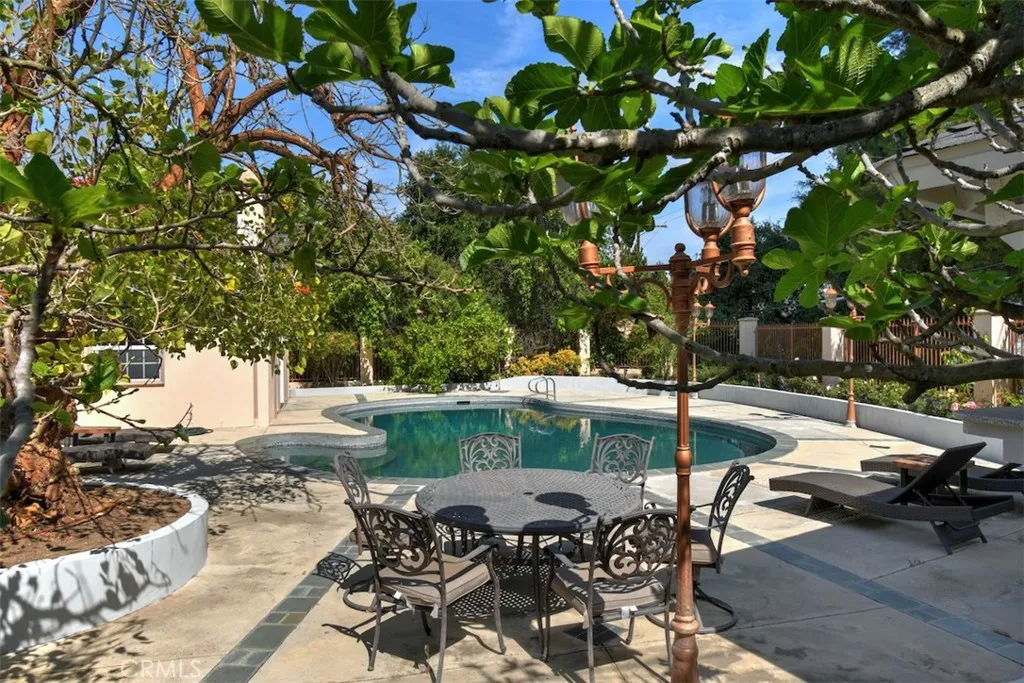 Nestled on a serene, tree-lined street, this magnificent gated estate offers a masterclass in single-level luxury, designed specifically for the sophisticated entertainer. From the moment you pass through the stately double iron doors, you are greeted by an atmosphere of grandeur, characterized by soaring vaulted ceilings, rustic wood beams, and the warm glow of dual cascading chandeliers reflected across polished stone floors. The home’s expansive living spaces flow effortlessly toward a wall of French doors and a hotel-inspired wet bar—complete with professional-grade refrigeration and an ice maker—making it easy to host gala-sized dinner parties for twenty or more. At the heart of the residence lies a true culinary sanctuary: a chef’s kitchen featuring custom cabinetry, rich granite surfaces, and a premier suite of Viking Professional and Sub-Zero appliances. The private quarters comprise four generous bedrooms, highlighted by a sumptuous primary retreat that serves as a personal sanctuary with its romantic fireplace, lounge area, and a spa-inspired bath featuring a deep jetted tub and a seamless glass massage shower. Outside, the ultra-private grounds transform into a resort-style oasis, where mature fruit trees and lush landscaping frame a sparkling pool and a built-in bbq, offering the ultimate backdrop for year-round alfresco living.