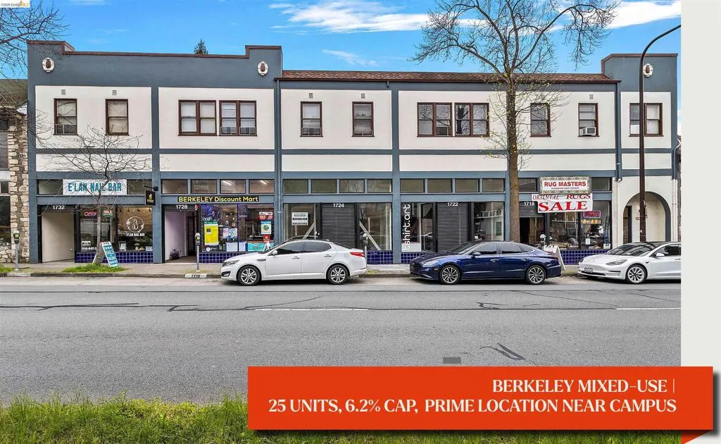 Positioned on Berkeley’s iconic University Avenue just five blocks from UC Berkeley, 1716-1732 University Ave is a 25-unit mixed-use asset offering scale, visibility, and strong in-place performance. The property includes 20 residential units (11 studios and 9 one-bedrooms) and 5 commercial spaces across 17,610 sq ft. A bright, skylit interior courtyard creates a welcoming central space while allowing natural light to flow through the building. Over $2.6M in capital improvements have been completed, including a seismic retrofit and a new roof in 2022. With a Walk Score of 95 and Bike Score of 100, tenants benefit from immediate access to Downtown Berkeley, BART, dining, and retail. Offered at a near 6.5% CAP and approximately $239/sf, this is a rare opportunity to acquire a high-exposure Berkeley asset with both income and long-term upside.