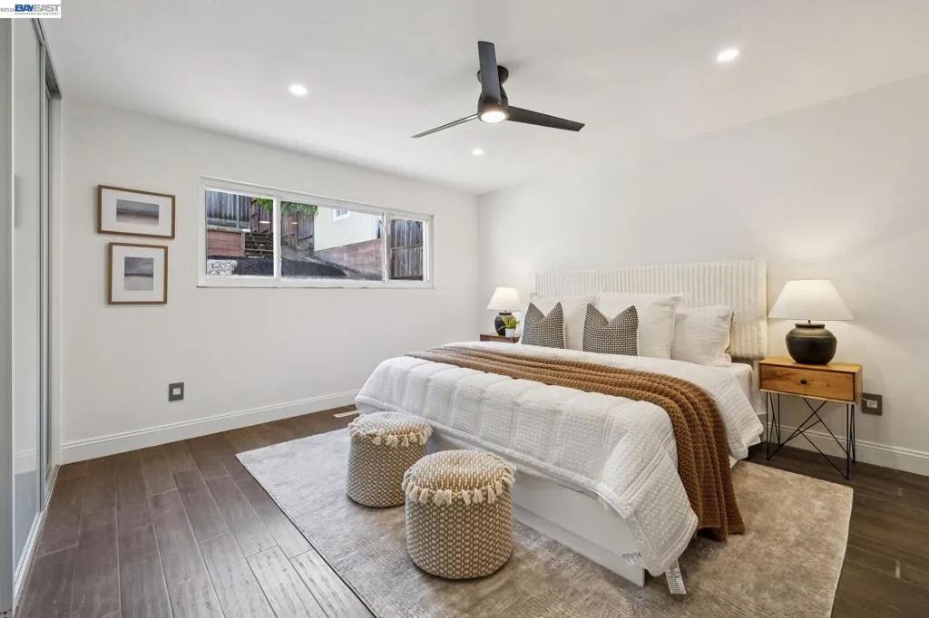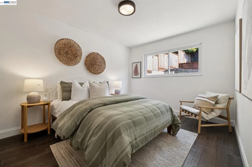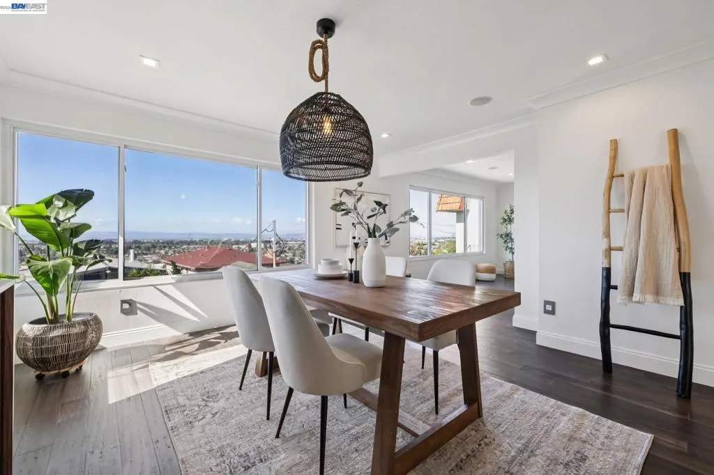 Surrounded by beautiful East Bay regional parks, this completely remodeled Mid-Century 3BD/2BA home offers stunning San Francisco Bay views in Oakland’s hillside neighborhood of Chabot Park. The stylish 1672 SQFT home enjoys picture windows that stream sunshine into the living and dining rooms and frame Bay views as the backdrop to your life - from downtown SF to far down the peninsula. Relax in front of the fireplace or entertain in the dining room. Recessed lighting and hardwood floors span into the upgraded eat-in kitchen with a large island, a wall of extra countertop space, and stylish cabinets. Cooking is easy as friends and family gather around the bar seating or in the breakfast nook. Downstairs find interior access to the two-car garage and laundry area. The three bedrooms are tucked away in the sleeping wing for privacy. The primary suite features backyard views, a spacious closet, and a gorgeous bath with dual vanity and towel warmer. Two bedrooms have roomy, custom closets and share a chic, modern hall bath. The giant backyard and patio offers plenty of room to unwind, garden, dine al fresco, and play. Out your front door, Oakland Zoo and miles and miles of trails are only blocks away, or golf, fish, or take the dog out at Chabot Park. Bonus: Sewer lateral compliant!