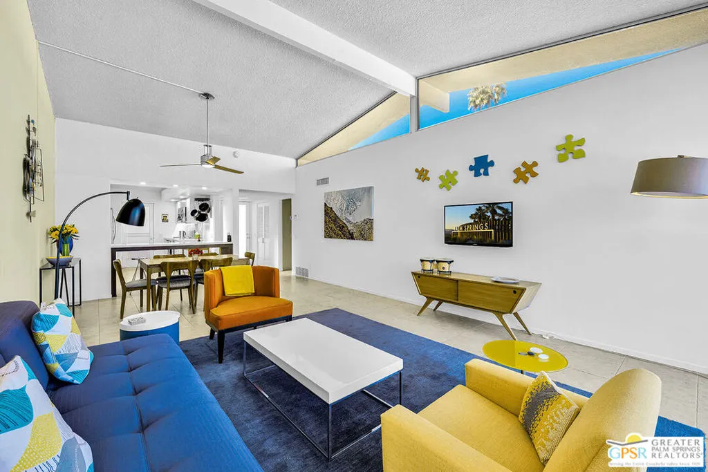 Add a splash of color to your life with this charming 2 bedroom and 2 bath fully turnkey furnished condo in the highly desirable Canyon View Estates community. Upon entering, you'll find a bright and airy open-concept living area, featuring a spacious combined dining and living room, all bathed in natural light. The inviting kitchen is perfect for culinary exploration, offering a thoughtful layout with ample storage space. Step outside onto the large private patio, ideal for relaxing, outdoor dining, or grilling, all while enjoying stunning views and complete privacy. After a long day, retreat to the generous primary bedroom, which provides both comfort and space, along with a beautifully updated, spa-like ensuite bath. Guests will appreciate their own private quarters, which also feature an updated bathroom. This unit is part of Phase One of the development, consisting of 28 homes, designed by the renowned architects Dan Palmer and William Krisel in the early 1960s. The community offers beautiful grounds, a pool and spa, and breathtaking mountain views, all with an atmosphere of peaceful tranquility. Contact agent today to schedule a private showing or for more information.