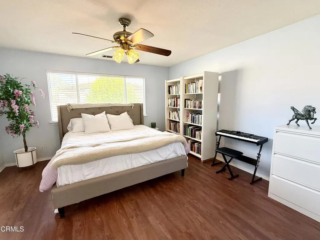 Welcome to this beautifully maintained 2-bedroom condo in the gated Marbella Villas community. Located around the corner from Antelope Valley College. This home features laminate wood flooring on the main level and newer laminate flooring upstairs as well. Both bedrooms are spacious en-suites, each with a walk-in closet, full bathroom, and ceiling fans. The inviting living room offers a cozy gas fireplace and wet bar, perfect for entertaining or unwinding at the end of the day. Step outside to your own private, gated courtyard with pavers and lush landscaping, an ideal space for morning coffee or evening relaxation.Residents of Marbella Villas enjoy a wide range of amenities, including a pool, spa, tennis court, recreation center, fitness room and playground. The HOA includes water and trash.Each unit comes with a private 2-car attached garage and upstairs laundry.