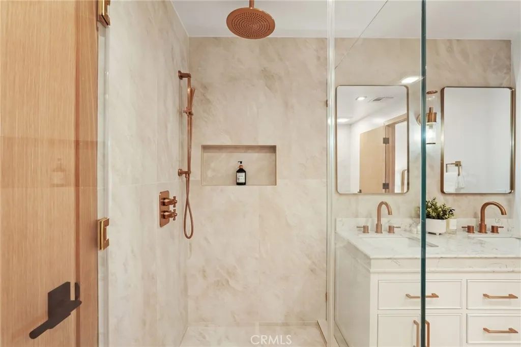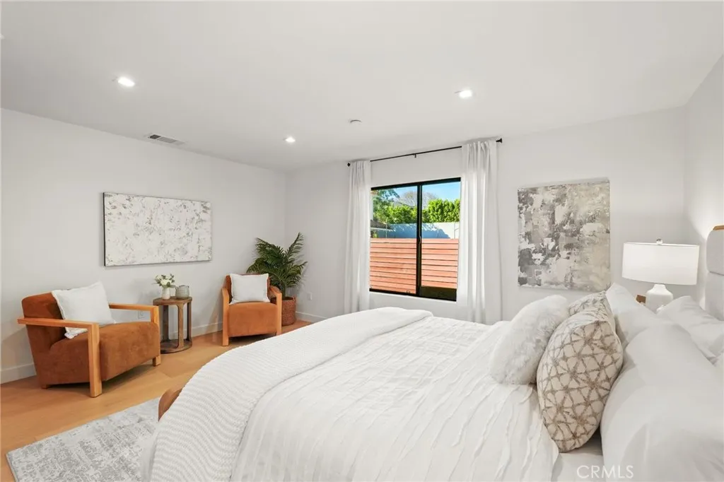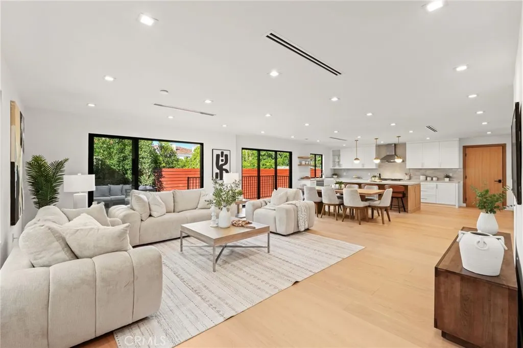 Situated on a quiet tree-lined street in one of Encino's most coveted neighborhoods, this turnkey single-story home has been beautifully remodeled and completely reimagined. Natural light floods the open-concept floor plan, highlighting the wide-plank European oak hardwood floors and lofty ceilings found throughout. At the heart of the home, the designer chef’s kitchen features a stunning 8 foot wide Taj Mahal island, bespoke cabinetry and top-of-the-line Bosch appliances. Thoughtfully designed for both everyday living and effortless entertaining, the kitchen flows seamlessly into the spacious living and dining room. A chic bar area with a beverage fridge adds an extra touch of convenience, while oversized sliding glass doors open to reveal a walk-out deck, expanding your living space outside for a seamless indoor-outdoor living experience. Mature ficus trees provide privacy to the serene backyard retreat, which is complimented by low-maintenance artificial turf. The home offers three generously sized bedrooms, highlighted by a luxurious primary suite that boasts a custom walk-in closet and spa-inspired bathroom, complete with a soaking tub, glass-enclosed rainfall shower, double vanity and smart toilet. Additional features include a stylish powder bathroom, state-of-the-art security system, Ecobee smart thermostat, high-efficiency 5-ton heat pump system, brand-new aluminum windows, a two-car garage with epoxy flooring and premium fixtures throughout. Located within the top-rated Hesby Oaks School District, this property is just moments from Ventura Boulevard’s renowned shops and restaurants, and its prime central location allows for easy access to everything the Valley and the Westside have to offer.