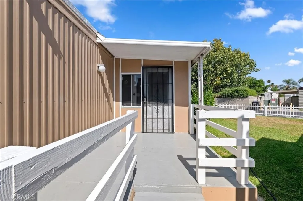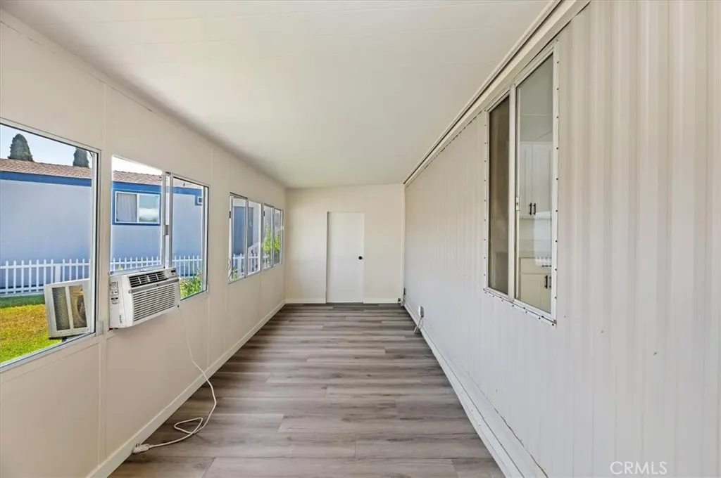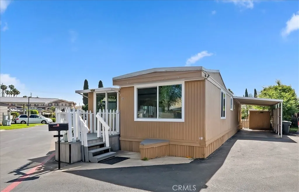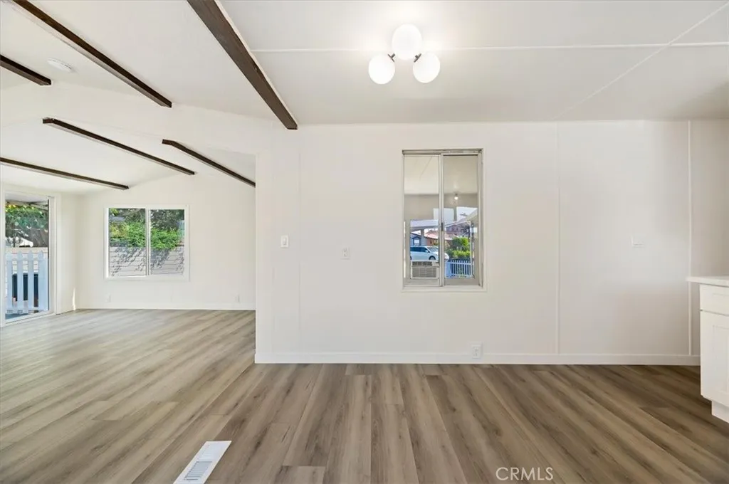 Welcome to the finest home in the highly sought-after Western Skies Mobile Home Park! This 2-bedroom, 1-bathroom residence has been meticulously transformed from top to bottom, offering high-end designer finishes and a modern aesthetic that rivals any new build in Anaheim. Step inside to an open-concept living space flooded with natural light. The vaulted ceilings are accented by striking dark wood beams, creating a perfect contrast against the crisp white walls and contemporary wide-plank flooring. The living room features a custom vertical wood slat accent wall, providing a sophisticated focal point for your entertainment area. The chef-inspired kitchen is a showstopper, featuring bright white shaker-style cabinetry with matte black hardware and elegant quartz countertops and a modern subway tile backsplash. In addition to the two spacious bedrooms, this home features a massive bonus room—perfect for a home office, gym, or second living area. The home also includes the rare convenience of a dedicated separate laundry room, ensuring your chores stay tucked away. While most mobile homes offer little more than a small patio, this property boasts a huge, private grassy yard! Fully fenced with a charming white picket border, it’s the ultimate space for pets, gardening, or weekend BBQs