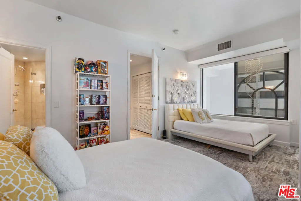 Welcome to The Wilshire Thayer, where refined luxury meets architectural distinction. This northwest-facing corner residence commands sweeping street and city views and offers an exceptional two-story layout encompassing approximately 2,146 square feet, with 2 bedrooms and 2.5 bathrooms. A formal entry introduces an expansive open-concept living and dining area, thoughtfully designed for both grand entertaining and everyday comfort. A contemporary fireplace anchors the space, while floor-to-ceiling glass walls frame the cityscape and open to a private balcony, seamlessly blending indoor and outdoor living. The gourmet kitchen is impeccably appointed with Carrara marble countertops, custom cabinetry, a generous breakfast bar, and premium Miele appliances. A well-proportioned den and an elegantly designed powder room complete the main level, which is unified by sleek porcelain tile flooring throughout. A dramatic spiral staircase leads to the upper level, where the primary suite serves as a tranquil retreat. This spacious sanctuary features its own fireplace, serene views, a walk-in closet with built-in safe, and custom cabinetry for ample storage. The spa-inspired primary bath offers a soaking tub, separate glass-enclosed shower, dual vanities, and a thoughtfully integrated dry bar with refrigerator. The junior suite enjoys a private full bath and overlooks the living area below through striking New York loft-style glass, creating a bold architectural statement. Plush carpeting, a discreet laundry closet, and a secondary private entrance enhance the comfort and functionality of the upper level. Ideally situated just moments from Beverly Hills, Century City, Westwood Village, UCLA, and nearby places of worship, this distinguished residence offers a rare combination of sophisticated design, premier location, and effortless convenience. Available for sale.