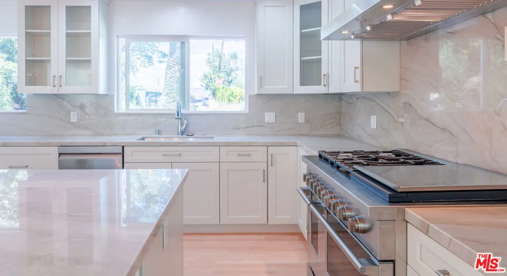 Set on a peaceful, quiet street, South of The Boulevard in the coveted Woodland Hills, this inviting home offers sweeping 360-degree mountain and valley views with an exceptional sense of privacy and calm. Thoughtfully updated throughout, the residence blends comfort and style with a brand new, beautifully remodeled kitchen appointed with premium appliances, modern black metal and frosted glass French doors, updated windows and sliding doors, fresh interior and exterior paint, and remodeled bathrooms with refined finishes. This homes open living area, decorated with a gas fireplace will keep you comfortable and safe with its newly upgraded central air, and a hardwired security system. The finished garage and upstairs addition you can use as a home office or secondary primary bedroom boasts its own walk-in closet, bathroom with dual vanity, full size shower and separate central air. As you make your way outside you'll find newly added fruit trees, refreshed landscaping, and thoughtfully designed water-collection planter boxes that add both functionality and charm. This homes outdoor living will keep your guests entertained as they enjoy a fully remodeled pool, built-in BBQ with refrigerator and generous parking on the property along with abundant, safe street parking as well. You will not only be just a few minutes from the famous Warner Center, but close to The Village, Westfield Topanga, popular dining, shopping, and entertainment Venues alike. The home also benefits from the area's exciting continued growth as Woodland Hills is part of the Warner Center 2035 vision for a more vibrant mixed-use hub, and Rams Village at Warner Center is planned to bring the Los Angeles Rams' permanent headquarters and training facility along with new residential, retail, office, entertainment, and open-space elements to the neighborhood. This momentum, together with the broader transformation of the former Promenade site, continues to elevate the area's long-term appeal and value. This Home Has Been Virtually Staged.