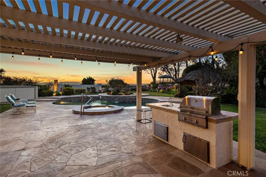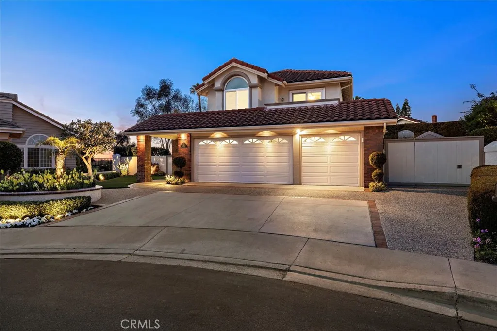 A STANDOUT OFFERING, defined by its EXTRAORDINARILY LARGE AND RARELY available lot size, this property presents a unique opportunity to enjoy space, privacy, canyon and city light views, and a true resort-style setting. Positioned at the end of a quiet cul-de-sac, the expansive grounds immediately set it apart—something not easily found. Thoughtfully designed to evoke the feeling of a private Hawaiian retreat, the backyard is the true centerpiece—lush, expansive, and layered with amenities that create a relaxed, elevated lifestyle. A sparkling pool anchors the space, complemented by a putting green, palapa-covered sandy lounge area, covered patio, built-in BBQ station, and a generous side yard offering flexibility for additional vehicle storage or future expansion. Inside, the home offers a functional and well-balanced layout with four bedrooms and three full bathrooms, with one bedroom and bath located on the main level. Vaulted ceilings and abundant natural light enhance the living spaces, while the floorplan creates a seamless connection between formal and casual areas. As you move toward the rear of the home, the layout transitions into an open-concept family room with a gas fireplace, seamlessly connected to the kitchen and breakfast nook, all overlooking the tropical backyard. Upstairs, the bedrooms are thoughtfully positioned for privacy, including a spacious primary suite with vaulted ceilings and a primary bathroom featuring a combination of stone countertops and tile surfaces, custom cabinetry, along with his and her closets. The upstairs hall bathroom has also been renovated with stone and tile surfaces and custom cabinetry. Additional highlights include OWNED SOLAR, dual-pane vinyl-clad windows, upgraded sliding glass door and French doors, a water softener, and a three-car garage with epoxy-coated floors and built-in cabinetry. A rare combination of lot size, location, and lifestyle—properties like this seldom come to market and present a compelling opportunity.