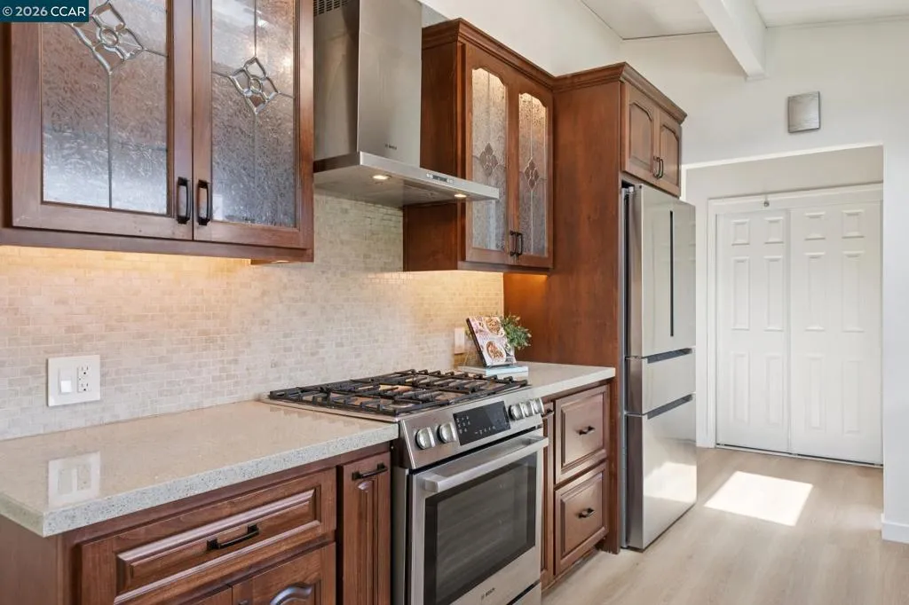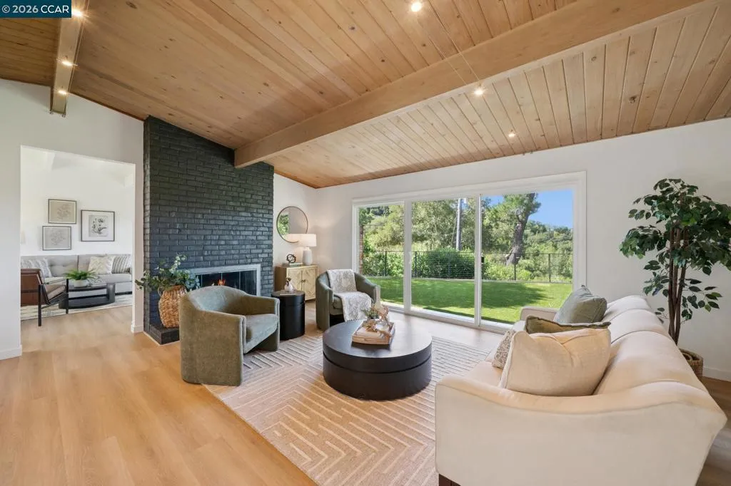 Discover this stunning single-story retreat, where fantastic curb appeal and breathtaking views perfectly capture the modern Lamorinda lifestyle. This home boasts a crisp, contemporary aesthetic featuring soaring vaulted ceilings and an open layout designed for seamless indoor-outdoor flow. The spacious living room, anchored by a sleek fireplace and large sliding glass doors, invites an abundance of natural light while framing peaceful views of Mt. Diablo and the surrounding hills. The heart of the home is a light-filled modern kitchen, stylishly equipped with premium quartz countertops and high-end Bosch stainless steel appliances. The backyard has been transformed into a private, low-maintenance oasis. Lush new faux-grass lawn provides year-round greenery, complemented by a versatile bonus shed - perfect for creative studio, home office, or extra storage. The primary suite serves as a true sanctuary with vaulted ceilings and views, while two additional bright bedrooms share a hall bathroom featuring a relaxing spa tub. Modern essentials include a new roof, smart thermostat, and smart lock. Ideally located near Theatre Square, BART, and Tilden Park, this move-in-ready gem offers a rare balance of quiet suburban luxury and urban convenience within a top-tier Orinda schools.