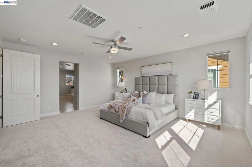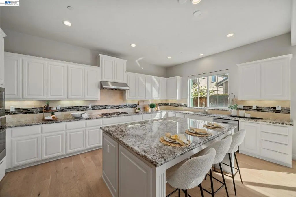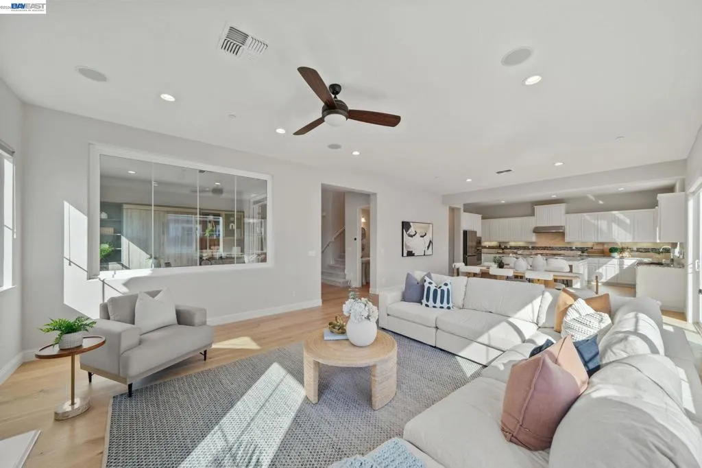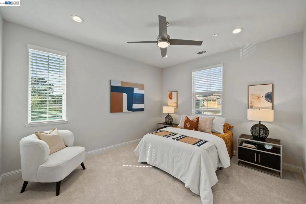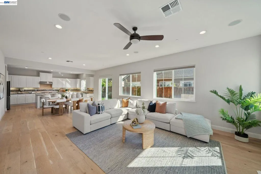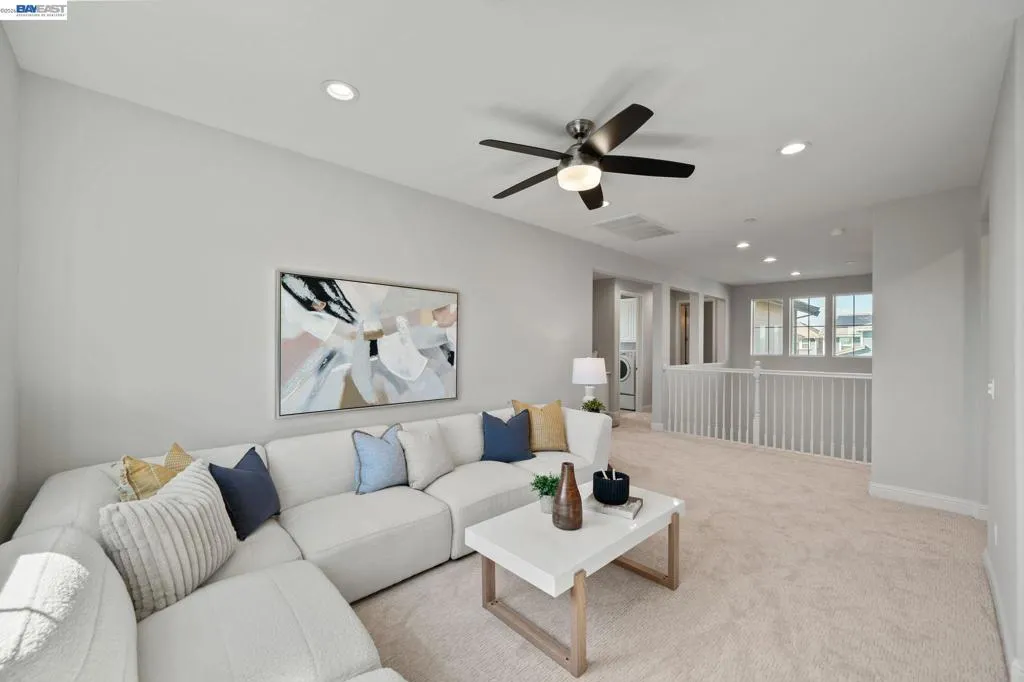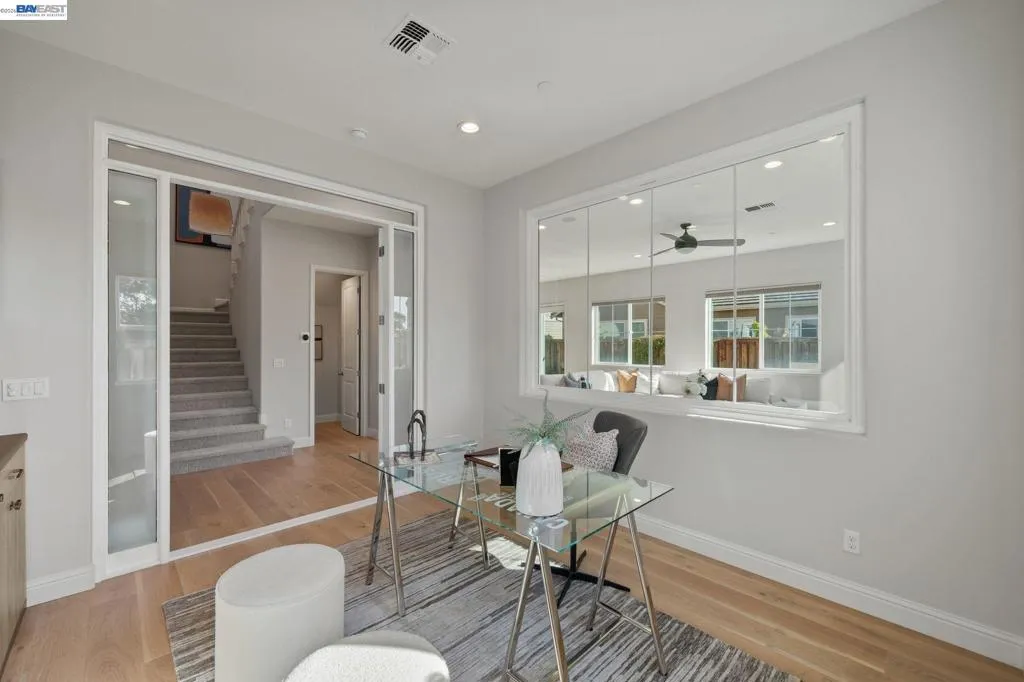 Beautifully designed DR Horton home in Patterson Ranch, built in 2016, offering 4 bedrooms, 4.5 baths, and approximately 3,402 sq ft of thoughtfully planned living space on a desirable corner lot. A generously sized downstairs suite provides excellent flexibility for guests, extended family, or multigenerational living. Fresh interior paint and new carpet create a crisp, move-in-ready feel throughout. The gourmet kitchen is appointed with granite slab countertops, a large center island, stainless steel appliances, and refined cabinetry that elevates the space with timeless style. The former formal dining room has been converted into a private office with a Murphy bed, offering ideal flexibility for working from home or accommodating overnight guests.The spacious main living area includes hardwood floors, surround sound, and a cozy fireplace. Upstairs, an oversized loft provides excellent bonus space for entertaining, along with a separate study area. The generous primary suite offers a soaking tub and separate stall shower. Additional highlights include solar power, 2 Tesla Powerwalls, an EV charger, a 3-car garage, and a beautifully finished backyard with decorative retaining walls and a verdant lawn. Located in Patterson Ranch’s urban farm-inspired community near trails, shopping, Facebook, Coyote Hills, BART, 880, and the Dumbarton Bridge.
