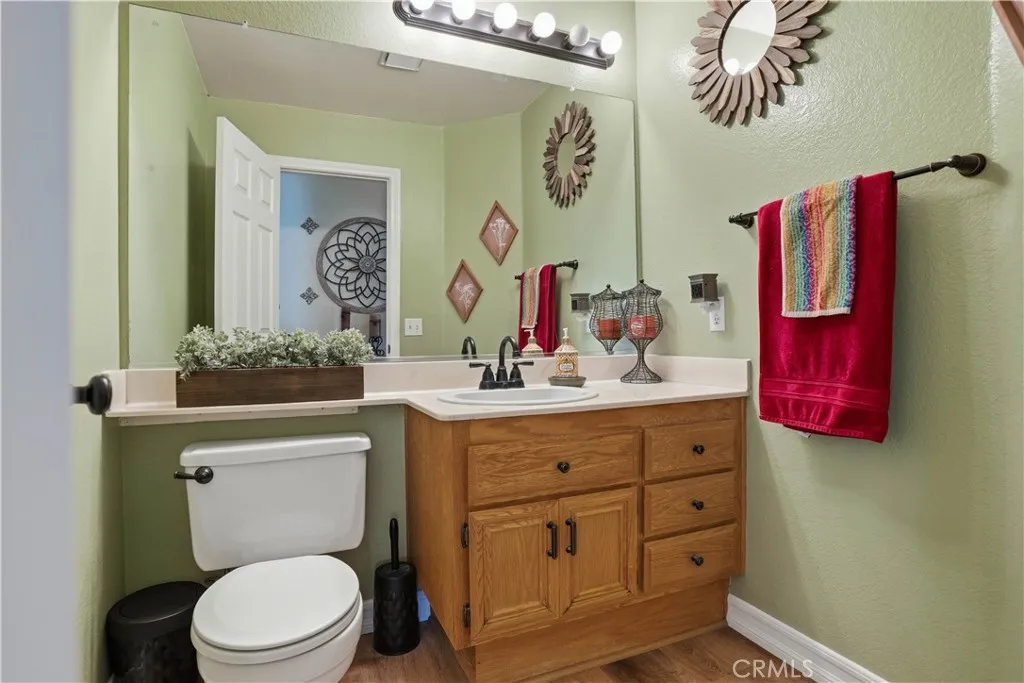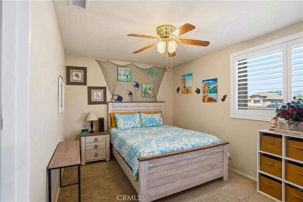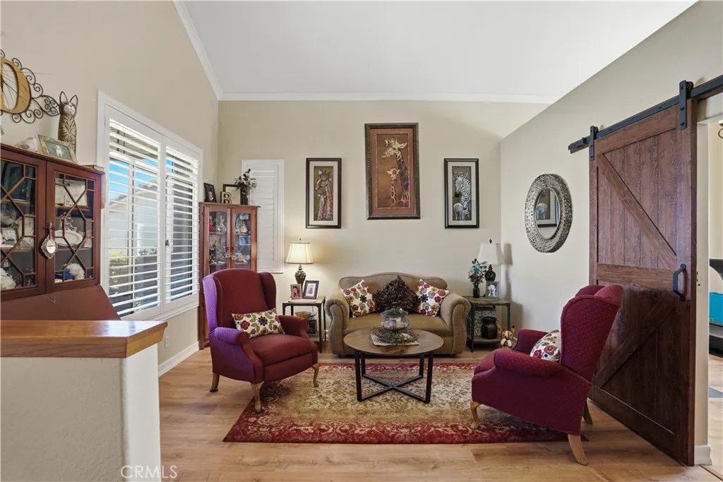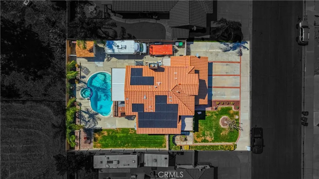 Two Story Hemet Pool Home offering 4 bedrooms, 2.5 bathrooms plus a 3 car garage. Featuring high ceilings as you enter with crown molding, all-new LVP flooring and baseboards complemented by plantation shutters throughout. The spacious layout includes a gas fireplace, downstairs half bath, and a recently updated HVAC system (2022) along with a whole house fan for energy efficiency. Upstairs offers a generous primary suite with a connection to one of the guest bedrooms, plus private access to an upper deck patio with alumawood cover. The primary bathroom features a walk-in closet, separate tub and shower, and dual functionality for comfort and space. All guest bedrooms upstairs include ceiling fans for added convenience. Step outside to a highly private backyard complete with a pool and spa, patio covers, a shed, concrete yard, grass area, sun-blocking screens, vinyl fencing and brick walls. Desirable RV parking pull-through gate access and parking for more along the side. Additional highlights include solar, low taxes, no HOA, and a prime location near shopping, schools, Idyllwild, and Palm Springs.