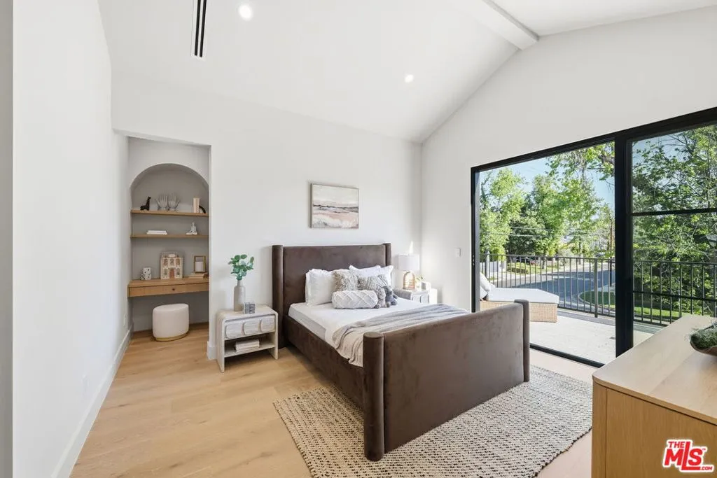 Modern organic newly built home on a prime Encino lot of over 10,000 sq ft, this refined farmhouse blends timeless architecture with warm, upscale design. Thoughtfully crafted with Roman clay plaster walls, soaring high ceilings, and an impressive open-concept layout, the home offers both comfort and sophistication. The main living spaces are designed for seamless indoor-outdoor living, filled with natural light and ideal for entertaining. At the center, the chef's kitchen features custom oak cabinetry, top-tier appliances, and an oversized island with breakfast seating. The primary suite is a true retreat, complete with a private balcony overlooking the yard, a spacious walk-in closet, and a spa-inspired bath. Home also offers a 1-bedroom ADU with its own kitchenette providing flexibility for guests, a home office, or extended living. The expansive backyard is a private oasis with a sparkling pool and spa, abundance of grass area and a built-in BBQ with bar seating, perfect for hosting or entertaining. Situated on a quiet tree lined street located near Encino's premier shopping, dining, and top-rated schools.