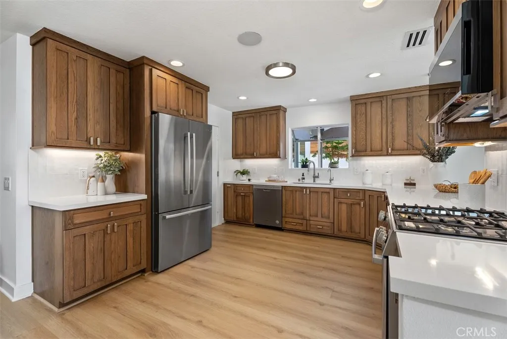 Beautifully expanded to approximately 2,001 sq ft, this exceptional Huntington Beach home features a fully permitted addition creating a private upstairs primary suite retreat with a custom walk-in closet and a spa-inspired ensuite bath with designer tile, stone countertops, and dual sinks. Thoughtfully designed by a licensed general contractor and premier builder, the home reflects quality craftsmanship and long-term functionality. The entry showcases soaring two-story ceilings, abundant natural light, and new flooring (2026). The upgraded kitchen offers quartz countertops, custom cabinetry, tile backsplash, stainless steel appliances, and recessed lighting. Downstairs includes three additional bedrooms and an updated dual-sink bathroom. Recent upgrades include new HVAC and ducting (2024), tankless water heater (2024), whole-house filtration system, repipe (2016), and newer roof. The finished garage features epoxy flooring, upgraded electrical, and a built-in laundry center. Expanded driveway accommodates 3 cars, boat, or RV. The private backyard is designed for low maintenance with turf, custom hardscape, block walls, outdoor shower, spa area, gas lines, smart lighting, and speakers. A rare opportunity where the quality of expansion, systems, and upgrades would be difficult to replicate at today’s cost.