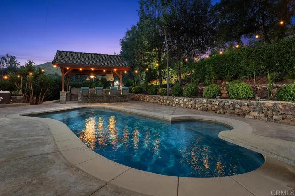 Welcome to 713 Quiet Hills Farm Road, a truly extraordinary and storied estate tucked into the highly sought-after Lake Hodges community, where timeless architecture, rich local history, and an unforgettable setting come together on nearly two acres of beautifully usable land. Originally built in 1935 by renowned author Harold Bell Wright and later owned by Reuben H. Fleet, this single-level farmhouse estate blends character and legacy with the comforts and design today’s buyers crave. Thoughtfully remodeled in 2017, with additional enhancements to the carriage house and office completed in 2020, the property has been carefully curated for modern living. Set behind a gated entrance and approached by a long, private, tree-lined driveway, the home offers a peaceful, secluded setting just minutes from I-15, dining, and everyday conveniences. Spanning approximately 4,448 square feet (plus an additional 400-square-foot loft), the residence features 5 bedrooms and 4.5 baths, all on one level. Classic farmhouse charm is paired with refined finishes and warm, inviting spaces designed for both entertaining and everyday comfort. At the heart of the home is a chef’s kitchen featuring dual Thermador ovens, a six-burner Thermador range, Sub-Zero refrigerator/freezer, Bosch dishwasher, and KitchenAid wine refrigerator. The kitchen opens seamlessly to expansive living areas and a central courtyard, creating easy indoor-outdoor flow. Large, light-filled rooms connect effortlessly to the surrounding grounds. Designed for gathering and making memories, the home offers a thoughtful collection of amenities including a temperature-controlled 120-bottle walk-in wine cellar and five historic cellars that add both charm and function. Outdoors, the estate is both beautiful and highly usable. A resort-style saltwater pool anchors the space, complemented by a gorgeous poolside cabana with an outdoor kitchen and dedicated entertaining area. Mature landscaping, curated gardens, and expansive improvements create a setting that feels lush, private, and serene. Owned solar for both the home and pool, energy-efficient systems, rainwater collection, and high-end synthetic turf with a custom wraparound mini-golf course add both sustainability and fun. Included in the sale is the adjacent 0.74-acre parcel (APN 270-261-30-00), bringing the total to approximately 1.87 acres of usable land. With over 40 mature fruiting trees, dual access, and potential for an ADU or second residence, the property offers exceptional flexibility, privacy, and long-term value. An attached carriage house has been transformed into a character-rich entertaining space and bar, with a spiral staircase leading to a 400-square-foot loft (not included in the main square footage), ideal for guests, recreation, or creative use. Every corner of the property supports both large gatherings and everyday moments—morning coffee in the courtyard, afternoons in the garden or greenhouse, and evenings spent outdoors. From neighborhood parties and garden afternoons to greenhouse harvests and year-round fruit from the orchard, the lifestyle here is as rich as the setting itself. Located in a community known for its quiet, serene landscapes and close-knit feel, where neighbors gather for holiday celebrations and seasonal traditions. This is a once-in-a-lifetime opportunity to own a home with deep history in one of North County’s most sought-after communities—where privacy, character, and connection come together in a way that is truly rare. Welcome home.