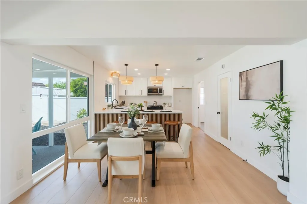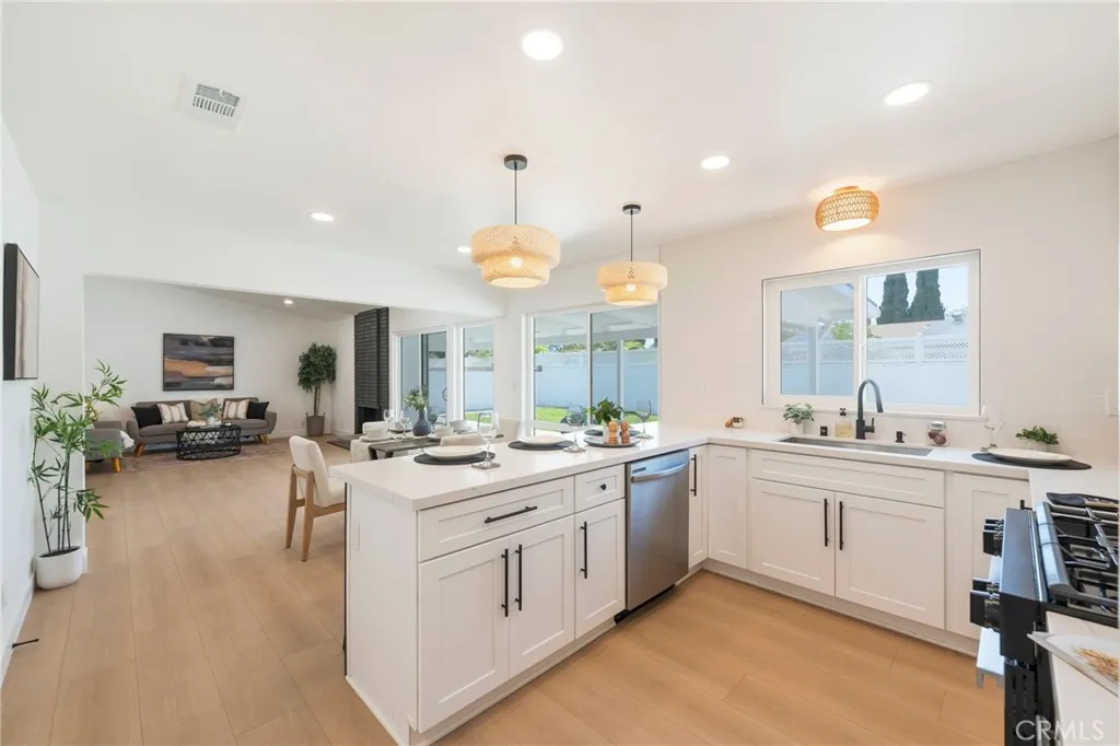 Welcome to this beautifully renovated single-story, mid-century modern home, where chic design meets luxurious comfort. Located in a highly desirable Mabury Park neighborhood in Santa Ana, CA. This stunning property boasts a spacious open floor plan with four (4) generously sized bedrooms and various premium features that elevate your living experience. Two full bathrooms have been tastefully renovated with trendy fixtures. Home is bright and airy, enhanced by recessed lighting, new pure white interior paint, and premium laminate wood flooring throughout the home. The heart of this home is the chef-inspired kitchen, complete with gleaming quartz countertops, all-new stainless steel appliances, shaker-style slow-close cabinetry, and a custom peninsula perfect for both cooking and entertaining. All new double-pane windows and sliders. There is a warm and inviting family room which features a beautiful fireplace, providing a perfect setting for relaxing. This home has a brand new roof that will last another 25+ years. Enjoy the private and cozy backyard to host all of your special gatherings. With its thoughtful design, premium finishes, and a fantastic layout, this home is the perfect blend of modern living and comfort. Great location and close to Orange County entertainment destinations. Don't miss this chance to make this property your DREAM HOME!
