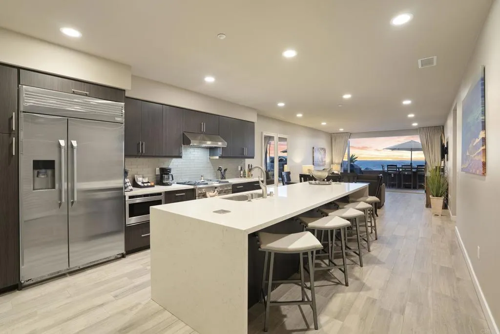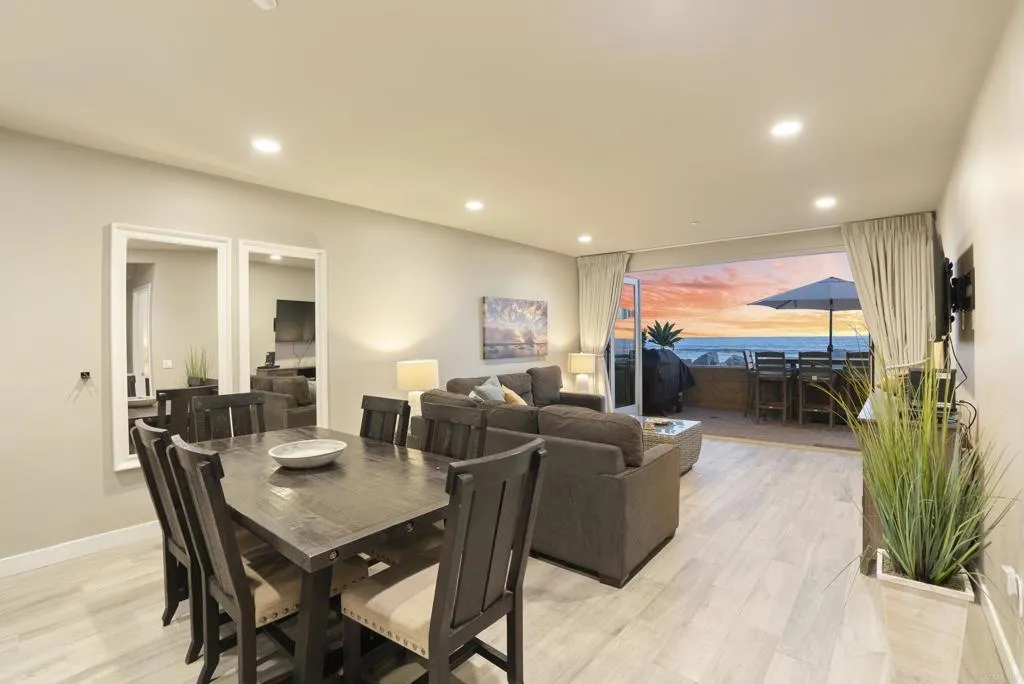 Experience true oceanfront living at one of Oceanside’s most coveted addresses—700 South The Strand. This stunning contemporary residence offers panoramic white-water ocean views creating a front-row seat to the Pacific and unforgettable sunsets. Designed with an open-concept, single-level floor plan with no stairs, the home offers easy, seamless access throughout. Indoor-outdoor living is elevated through expansive folding glass doors that open to a spacious private patio—perfect for relaxing, entertaining, or enjoying the beach lifestyle just steps away. The primary bedroom enjoys tranquil ocean views and direct access to the patio, offering a serene coastal retreat. The open kitchen is ideal for entertaining, featuring generous counter seating and a layout that flows effortlessly into the living and dining spaces. The residence includes two spacious bedrooms, two and a half bathrooms, private in-unit laundry, a large owner’s storage room, plus an additional private storage space conveniently accessed from the garage. Offered fully furnished and completely turnkey, this home is ready to enjoy immediately—just bring your suitcase. The HOA allows short-term rentals, making it an exceptional opportunity for both personal enjoyment and investment potential. Additional highlights include stair-free access, two assigned parking spaces in a gated, secure garage, and a striking contemporary building design that stands out along The Strand. Located moments from the pier, harbor, shops, dining, and all that downtown Oceanside has to offer, this is coastal luxury living at its finest. Don't miss your chance to own a slice of paradise!