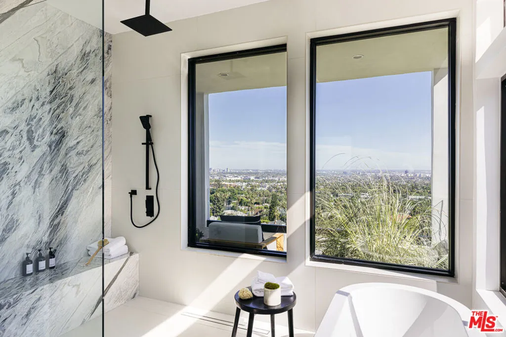 Available Fully Furnished & Turnkey for Short or Long-Term Lease. Perched above the city with rare 270 jetliner views from Downtown to Century City, this fully renovated 4 bedroom, 4 bathroom Hollywood Hills retreat spans over 4,000 sq ft of high-impact design and effortless livability. A custom pivot door opens to a dramatic double-height foyer and floating oak staircase leading to expansive, sun-splashed living areas. Retractable glass walls dissolve the line between indoors and out, connecting herringbone-floored living and dining spaces to a wraparound terrace perfect for entertaining. The gourmet marble kitchen features bespoke oak cabinetry, Thermador appliances, and a hidden walk-in pantry; a chic powder room with integrated Calacatta Viola vanity completes the main level. Upstairs, a custom sauna sits just outside the luxe primary suite with private balcony, spa-style bath (soaking tub + marble shower), and generous walk-in closet. Two additional bedrooms, a full bath, and laundry round out this floor. On the lower level, a separately accessed ADU (interior and private exterior entries) offers a wet bar, full bath, and wraparound windows ideal as a guest suite, creative studio, private gym, or rental opportunity. Outdoors, enjoy a turf yard, lemon tree garden, and spaces suited for a cold plunge or cozy lounge. A two-car garage adds convenience. Quiet, private, and minutes to Sunset Blvd., West Hollywood, and Beverly Hills, an elevated escape with everyday ease. Not furnished as shown.