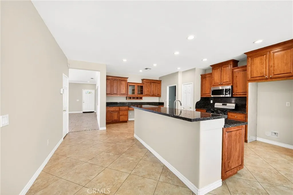 This stunning, move-in-ready, one-story home is situated on a corner lot and features 5 spacious bedrooms, an oversized entertainer's kitchen, and lots of upgrades throughout. Entertainer's Dream Kitchen with Granite countertops Breakfast Bar and Stainless Steel appliances. Extra counter space and pantry are bonus. Great room is vast and bright with many windows and an elegant granite finish fireplace. Master bathroom is nice with dual sink vanity and separate tub and shower. Most bedrooms have walk-in closets. Outside- larger lot is low maintenance with extra cement surrounding the exterior and covered patio plus high privacy fence. Come and See!