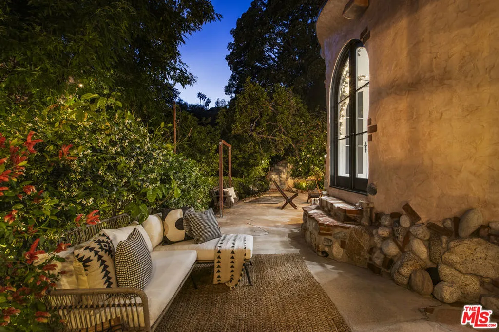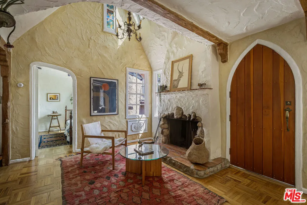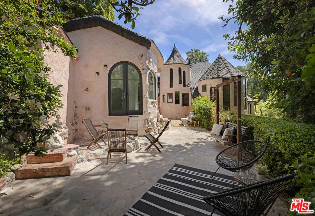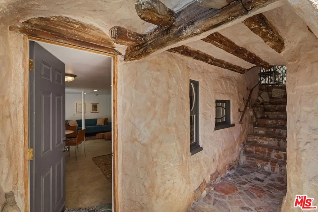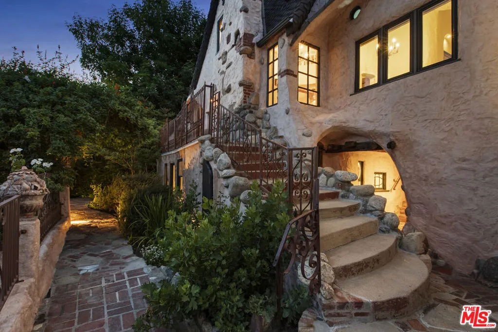 "The Pink Castle," c. 1922. This sprawling French-inspired Storybook compound, built over four years by pioneering special effects artist Paul Sprunck in collaboration with architect Arthur Cass Munson, is an ode to Hollywood's boomtown era. Exquisitely restored over 30 years, the estate features a main house with 2 bedrooms, 2 baths, and multiple flex spaces (1,885 sq ft), a detached art studio/guest suite (442 sq ft), and a lower-level studio/guest suite (517 sq ft) on an oversized 8,000+ sq ft lot. The main living room features 18' high ceilings, original and rebuilt lath and frosting-like plaster walls, dense hand-carved beams, and a sculptural staircase rising to a landing ideal for reading or mixing cocktails for guests below. The upper bedroom, with exposed wood ceilings, a hidden loft and sweeping vistas, feels lifted from a fairytale. Through the thick arched doorways of an office/napping room, you enter a second grand living area with a stone fireplace, cathedral ceiling, and golden light streaming through nearly a dozen oversized windows. The depth and softness of a space crafted when everything was built by hand is hard to ignore, even as you take in the dining room, flanked by a marvelously renovated kitchen with curved counters that follow the home's contours, and the rounded grace of a turret with two fairytale-like alcoves. The second bedroom is a study in art and design, with storage secreted into every usable space, ocean views, and a pink stucco and tile bath with soaking tub. Outside, an expansive patio with gentle walkways and forged metal fences and gates leads to magical gardens with citrus trees and two additional living structures. The first, a detached studio/guest suite with powder room, blends seamlessly with the original architecture, featuring rounded walls, soaring ceilings, and a custom floor of salvaged stone. The second, a lower-level suite, includes a full bath and ample space for long-term guests or potential rental income. There are too many character details to mention as this is a home that defies written description and must be experienced in person. Suffice it to say, the Pink Castle, moments from Highland Park's vibrant core and within the coveted Mt Washington Elementary school district, is not only steeped in the glory of the past but ready for your future.