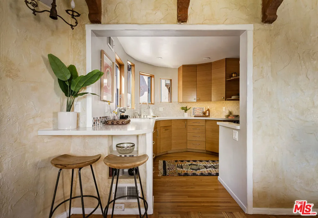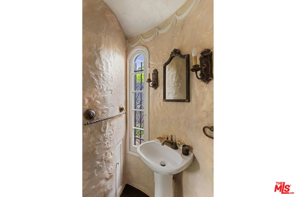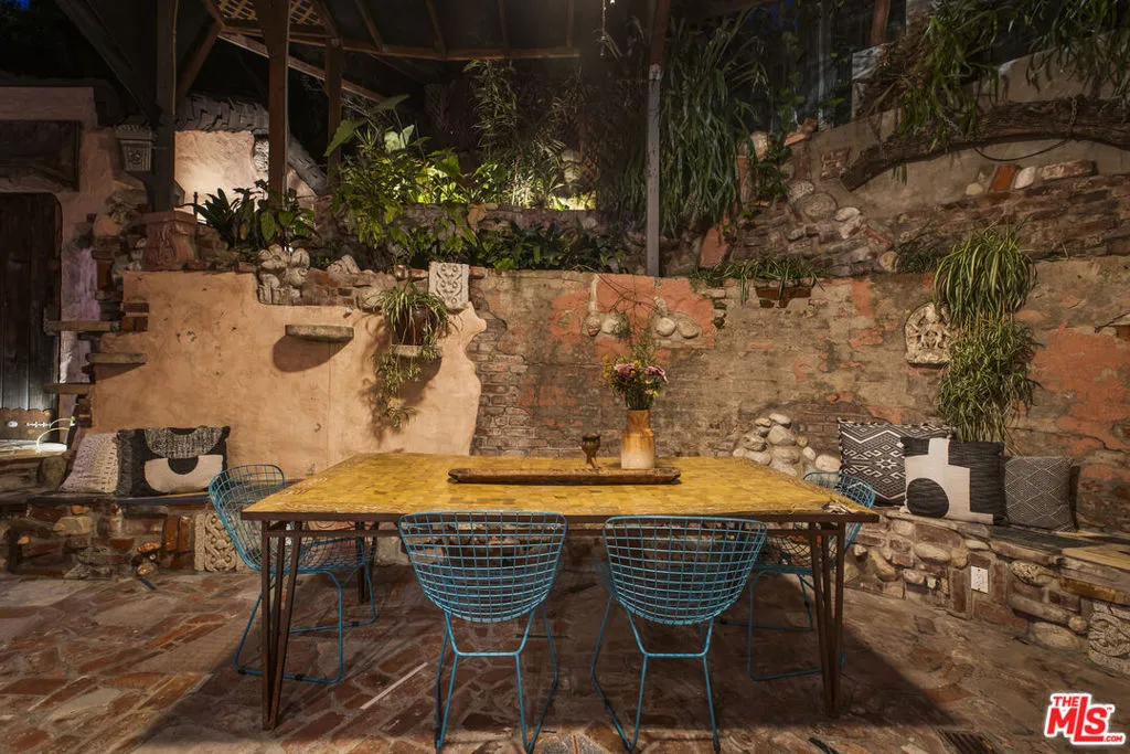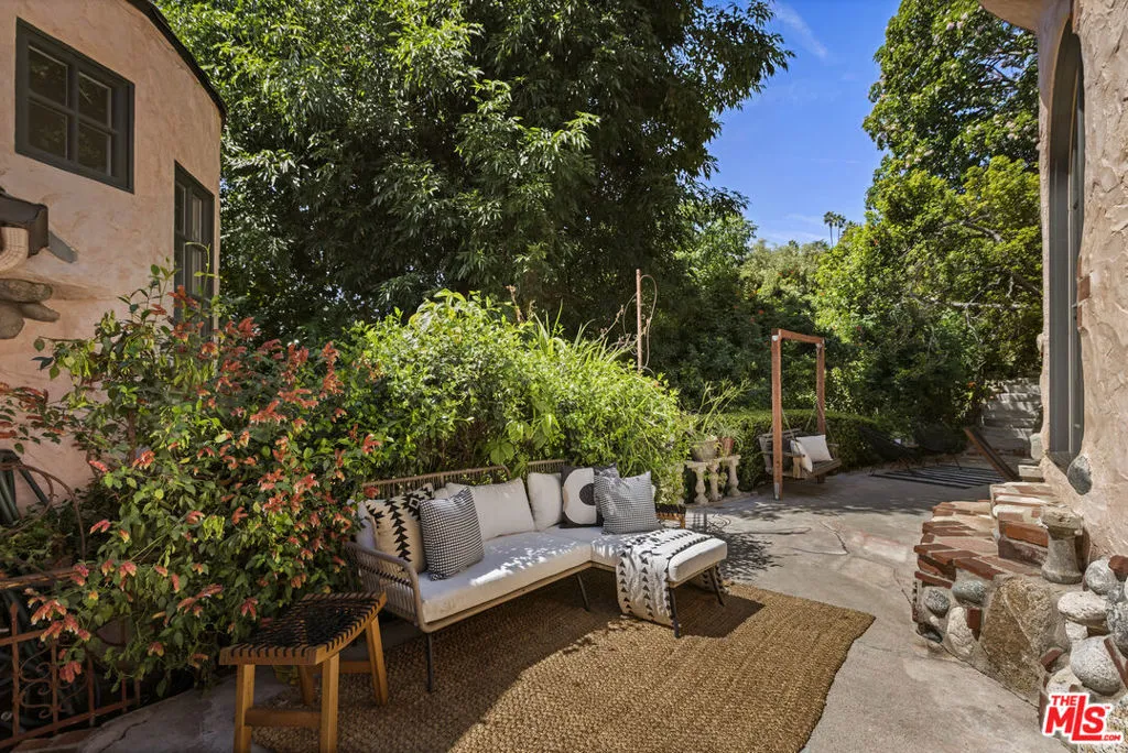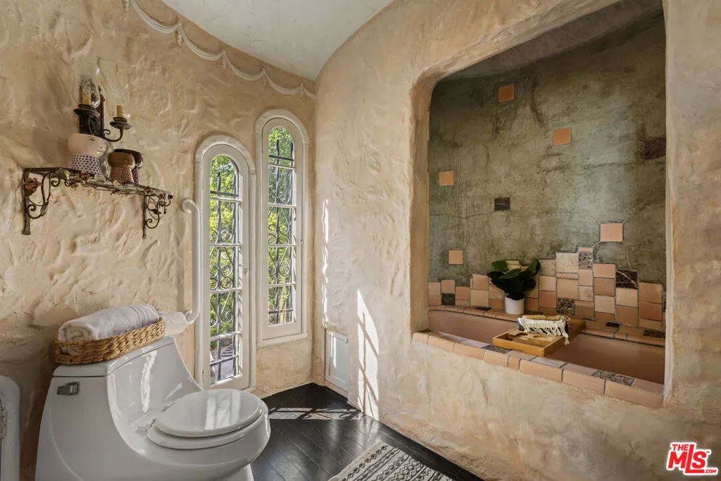 "The Pink Castle," c. 1922. This sprawling French-inspired Storybook compound, built over four years by pioneering special effects artist Paul Sprunck in collaboration with architect Arthur Cass Munson, is an ode to Hollywood's boomtown era. Exquisitely restored over 30 years, the estate features a main house with 2 bedrooms, 2 baths, and multiple flex spaces (1,885 sq ft), a detached art studio/guest suite (442 sq ft), and a lower-level studio/guest suite (517 sq ft) on an oversized 8,000+ sq ft lot. The main living room features 18' high ceilings, original and rebuilt lath and frosting-like plaster walls, dense hand-carved beams, and a sculptural staircase rising to a landing ideal for reading or mixing cocktails for guests below. The upper bedroom, with exposed wood ceilings, a hidden loft and sweeping vistas, feels lifted from a fairytale. Through the thick arched doorways of an office/napping room, you enter a second grand living area with a stone fireplace, cathedral ceiling, and golden light streaming through nearly a dozen oversized windows. The depth and softness of a space crafted when everything was built by hand is hard to ignore, even as you take in the dining room, flanked by a marvelously renovated kitchen with curved counters that follow the home's contours, and the rounded grace of a turret with two fairytale-like alcoves. The second bedroom is a study in art and design, with storage secreted into every usable space, ocean views, and a pink stucco and tile bath with soaking tub. Outside, an expansive patio with gentle walkways and forged metal fences and gates leads to magical gardens with citrus trees and two additional living structures. The first, a detached studio/guest suite with powder room, blends seamlessly with the original architecture, featuring rounded walls, soaring ceilings, and a custom floor of salvaged stone. The second, a lower-level suite, includes a full bath and ample space for long-term guests or potential rental income. There are too many character details to mention as this is a home that defies written description and must be experienced in person. Suffice it to say, the Pink Castle, moments from Highland Park's vibrant core and within the coveted Mt Washington Elementary school district, is not only steeped in the glory of the past but ready for your future.