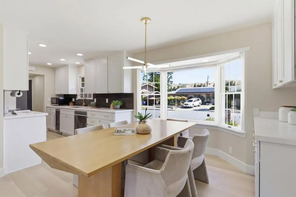 Facing north-east 3 beds, 2 baths home offers 1,342 sq. ft. of living space on a 6,480 sq. ft. lot within the Mission San Jose High School - Fremont Unified School District. The kitchen features quartz countertops, an electric cooktop, oven range, microwave, dishwasher, garbage disposal, exhaust fan, refrigerator, and a wine refrigerator. The open kitchen/family room combo includes a dining area and a wood-burning fireplace in the family room. Flooring consists of New laminate and tile throughout. Bathrooms include updated tile, double sinks, and a primary bath with stall shower(s) and a separate shower and tub. Laundry is equipped with a washer and dryer. Additional amenities include central forced air heating, New duct, New central AC, double-pane windows, water softener, owned solar, 2 car attached garage, bay window, and a built-in audio system. Backyard has a den so you can use as home office. The house is ready to move in. Do not miss this opportunity!