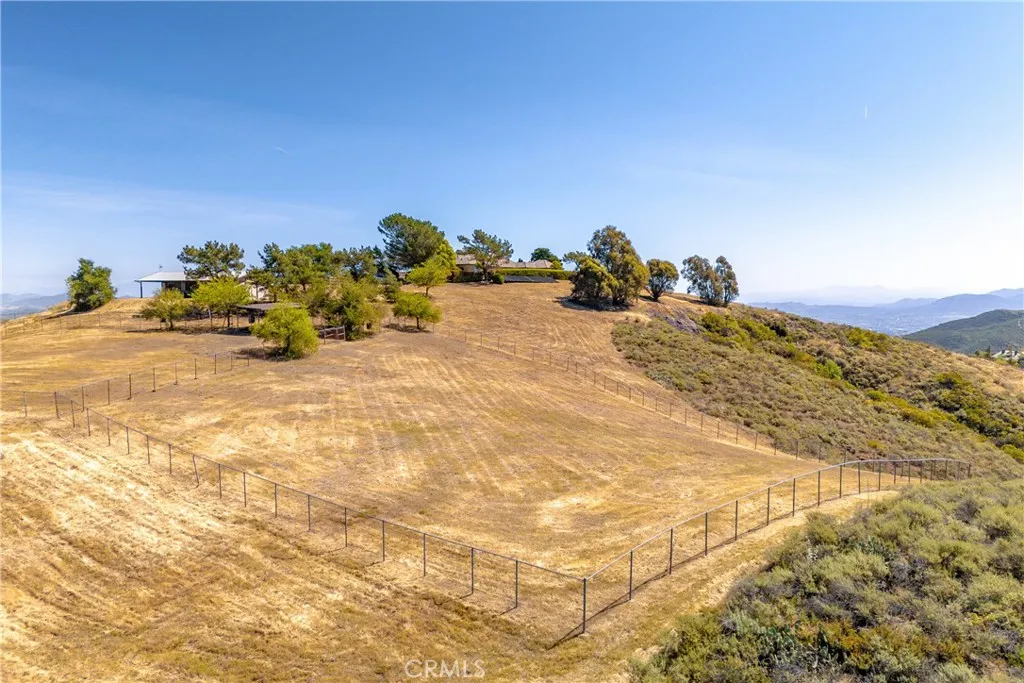 First time on the market, exceptional estate offers sweeping panoramic city light views with a peek of the Pacific, ideally situated in one of Temecula’s most sought-after locations. Perched atop a scenic knoll, the property spans 20 fully fenced acres with a gated entry, large horse and animal facilities. Complete privacy just minutes from I-15 and Old Town Temecula. The custom single-level residence showcases classic French Provincial exterior architecture, originally built in 1984 with timeless brick construction and a durable concrete roof, both meticulously maintained. Designed with a traditional yet functional layout, the home features four bedrooms plus a generously sized office, expansive light-filled living spaces, and floor-to-ceiling windows throughout allow you to capture stunning views from every room. Abundant cabinetry and storage complement the solid construction, offering an ideal canvas for a buyer to update or reimagine to their taste. Outdoor amenities include a pool and open patio surrounded by mature landscaping, perfect for enjoying the tranquil setting. The property also features a separate four-stall barn with two fenced 1+ acre paddocks and an additional 2 stall covered barn. Ample space for additional outbuildings or a guest home, creating potential for a family compound. With no HOA, 5-acre zoning (buyer to verify subdivision potential). The land offers gently rolling terrain and picturesque panaramic vistas.