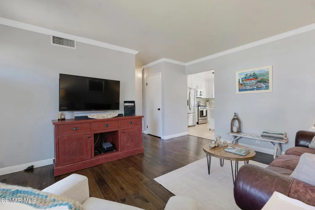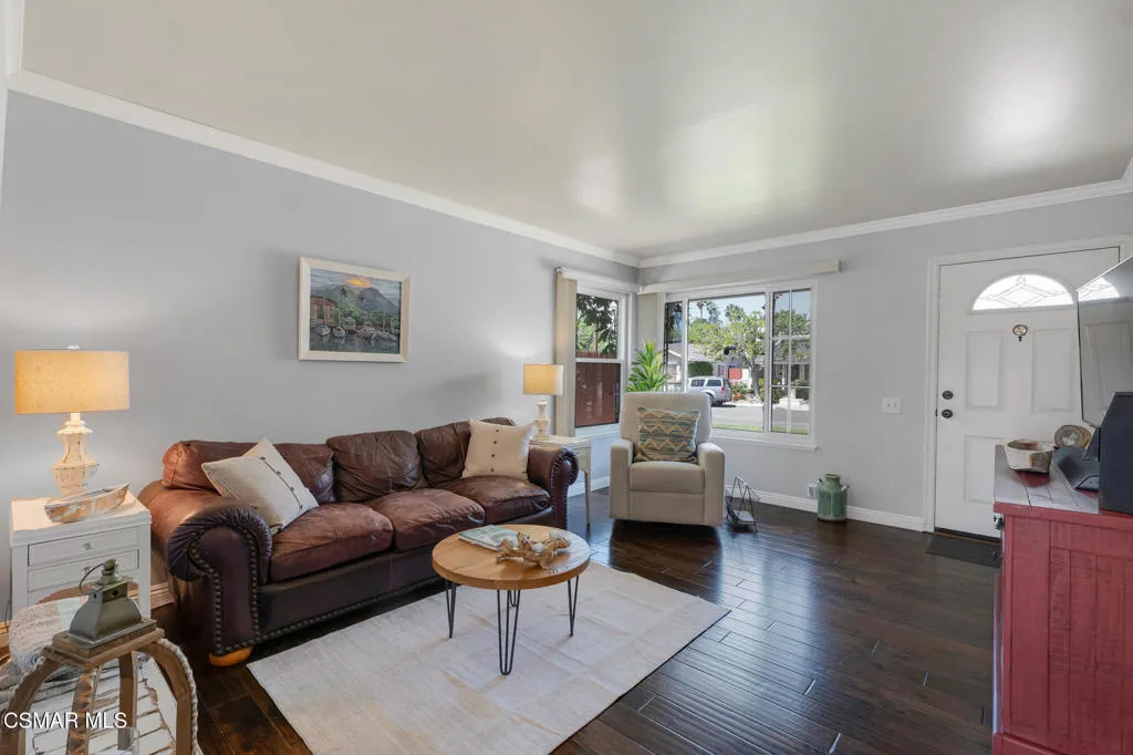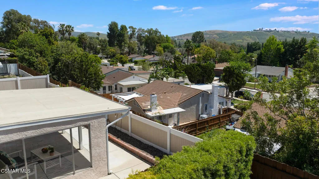Lovely, upgraded cul-de-sac home with dark hardwood American Hickory flooring in the living room, hallway closets and bedrooms. Remodeled open kitchen with ceramic tile flooring, butcher block island, quartz counters, stainless steel appliances, solid panel cabinets, solid wood tongue & grove soft closing drawers, large solid wood tongue and groove pullout drawers, farmhouse sink adjacent to dining area and double glass slider leading to the lighted outdoor covered patio & backyard featuring an expansive, panoramic 180 degree view of the Conejo Valley and mountain tops. Dual pane windows throughout, Crown Moldings throughout & 4'' baseboards. Primary en-suite bedroom with renovated primary bath featuring ceramic wood plank tile flooring, newer vanity and sink. Remodeled full bath with tile floor and shower over tub. Dual pane windows throughout, ceiling fans in every bedroom. Newer 3 ply shingle roof, AC & Furnace. Great location with walking trails and nearby park, close to schools, shopping, restaurants and freeways,