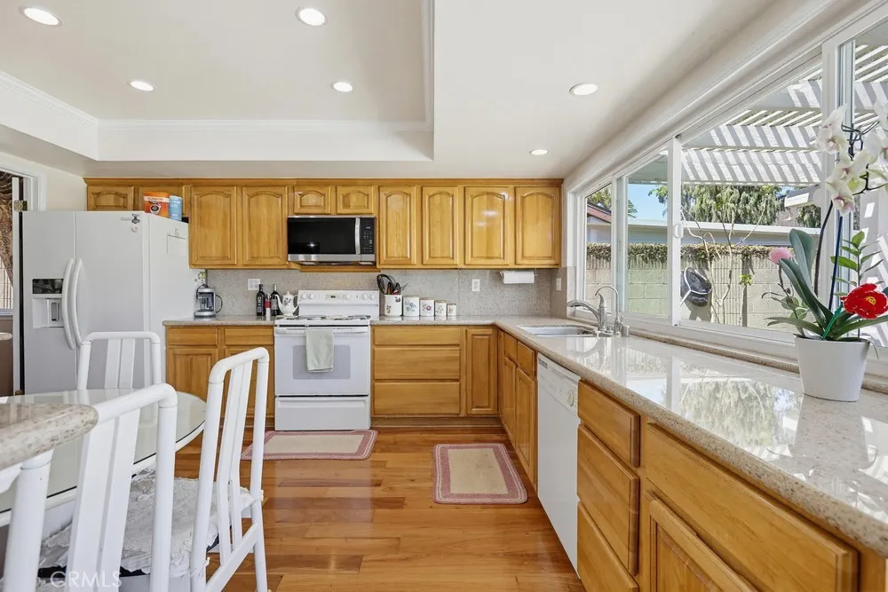 Welcome to 4171 Paseo De Plata, a beautiful residence located in one of Cypress’s most sought-after neighborhoods. This home perfectly blends classic California charm with spacious, light-filled interiors and a backyard built for the ultimate summer lifestyle. As you step through the elegant extra-wide door entry, you are greeted by an expansive living room featuring soaring vaulted ceilings and a dramatic floor-to-ceiling brick fireplace. Natural light pours in through a large skylight and elegant shutters, highlighting the rich wood-toned flooring that flows throughout the main living areas. The heart of the home is the bright, open-concept kitchen equipped with: • Substantial oak cabinetry for ample storage. • Durable granite-style countertops and a clean, white appliance suite. • A charming breakfast nook and a large window overlooking the pool. • A formal dining room with a classic chandelier, perfect for hosting family gatherings. Step through the sliding glass doors to find your own private resort. The backyard is an entertainer's dream, featuring: • A sparkling swimming pool, pristine and ready for the summer heat. • A large concrete patio shaded by a classic white pergola—ideal for al fresco dining. • Privacy-enhancing block walls and lush greenery, including mature fruit trees. Located in a central "hub" of Orange County, this home offers unparalleled convenience. You are minutes away from the 91, 605, and 22 freeways, making any commute a breeze. With Beach Blvd nearby, premier shopping, dining, and local parks are right at your fingertips.