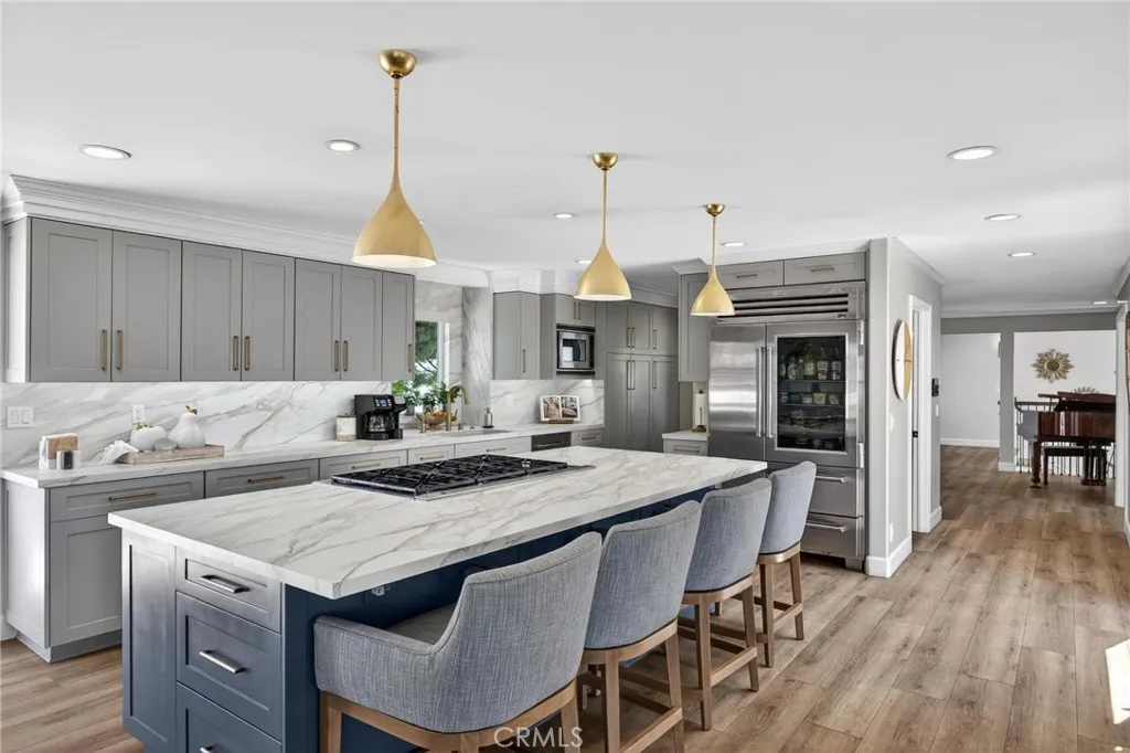 The perfect blend of a beach lifestyle and modern sophistication - this is a unique and rare gem in Hermosa Beach. Perched on an oversized corner lot in the heart of Hermosa Beach, this private coastal villa captures timeless Spanish-inspired architecture through refined design with a curated, modern interior palette. Thoughtful architectural details and warm finishes create an atmosphere that feels both elevated and welcoming. Lush greenery and framed by swaying palm trees, this coastal villa offers the rare combination of resort-inspired living, serenity, thoughtful functionality, privacy, sophistication and timeless appeal. Step through the arched entryway and custom wrought-iron door into a naturally sunlit foyer with soaring ceilings and elegant detailing. The floor plan invites effortless living with multiple indoor-outdoor spaces that capture ocean breezes and golden South Bay natural light. The entry level south wing offers a secluded sanctuary offering a warm stone fireplace, private outdoor veranda and grassy yard, hotel spa inspired bathroom with separate sink counters, primping station, oversized shower and dual closets. The north wing has three additional bedrooms, an en suite with outdoor access to spa and patio. The additional two bedrooms are well appointed with ample closet space and share a dual sink bathroom. This wing enjoys a full kitchen offering convenience and privacy for family members and guests, two car garage, laundry room, tool work area and storage. Retreat upstairs to the heart of the home in the warm family room with walls of windows and views that stretch beyond rooftops and spectacular sunsets, built-ins, a dual-sided fireplace that also accommodates the outdoor TV deck. Bask in the sunroom with a wall of western windows plus interior windows inviting ocean breezes and sunlight. Enjoy the open piano area and formal dining room. Relish cooking and entertaining in your gourmet kitchen that includes a 48” SubZero Pro refrigerator, 48” six burner gas cooktop, colossal island that opens seamlessly to a dining area, perfect for gatherings. Outdoor barbeque and bar or up the stairs to ocean views from the rooftop sky deck. Upstairs is a chic yet functional private and spacious office featuring custom cabinetry and bookshelves. Additional highlights - hardwood-like floors, designer lighting, security system and AC. Multiple flexible living areas and decks provide intimate spaces to unwind or host festivities for all lifestyles.