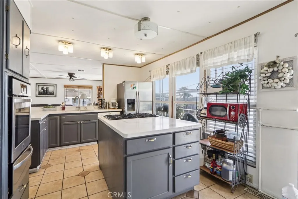 Style meets flexibility in this spacious 1,440 sq ft double-wide located in Rancho Hermoso—one of Sylmar’s most sought-after communities, where pride of ownership and a welcoming neighborhood atmosphere set the tone for everyday living. A charming front porch creates the perfect spot for morning coffee or unwinding at the end of the day. Step inside and the open-concept layout immediately makes its presence known, with natural light pouring through multiple windows and laminate and tile flooring flowing throughout the living spaces for a clean, modern feel. The living room offers plenty of space to relax or gather, while the kitchen delivers both style and function with quartz countertops, grey cabinetry, abundant storage, custom lighting, and generous prep space. Its seamless connection to the dining and family areas makes entertaining easy—whether it’s a casual dinner night or a lively weekend get-together. Two comfortable bedrooms provide restful retreats, each with ceiling fans for added comfort. The primary suite offers extra space to recharge, complete with dual closets and a beautifully remodeled private bathroom. A second remodeled bath serves the rest of the home with equal style. One of the standout features is the versatile bonus room—perfect as a home office, creative studio, workout space, or even a potential third bedroom depending on your needs. A conveniently located laundry room with ample storage keeps daily life running smoothly. Practical upgrades add peace of mind, including a newer HVAC system for year-round comfort, updated copper plumbing, newer insulation and ceilings, a newer water heater, and two outdoor storage sheds. Parking for two vehicles adds everyday convenience. Life here extends beyond the front door. Residents of Rancho Hermoso enjoy access to a sparkling community pool and recreation center—ideal for sunny afternoons, neighborhood gatherings, and relaxing weekends close to home. Space to spread out, room to adapt, and a community that makes it easy to enjoy the lifestyle Sylmar is known for.