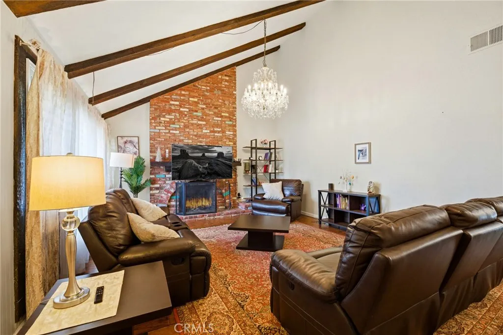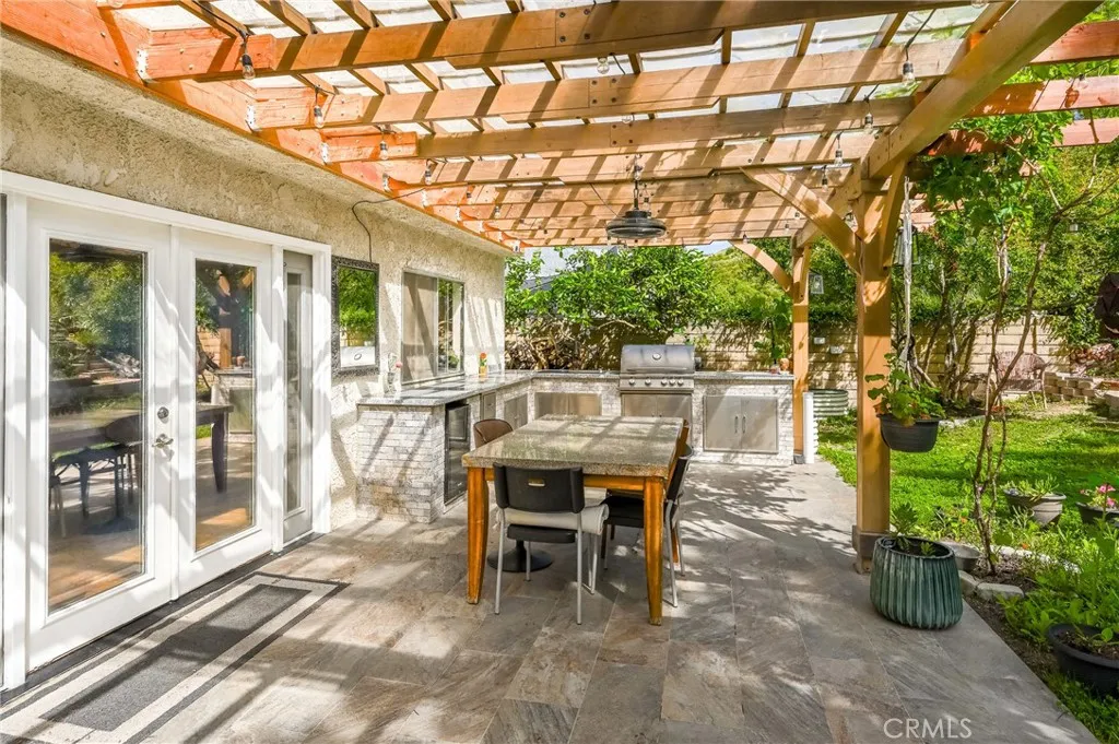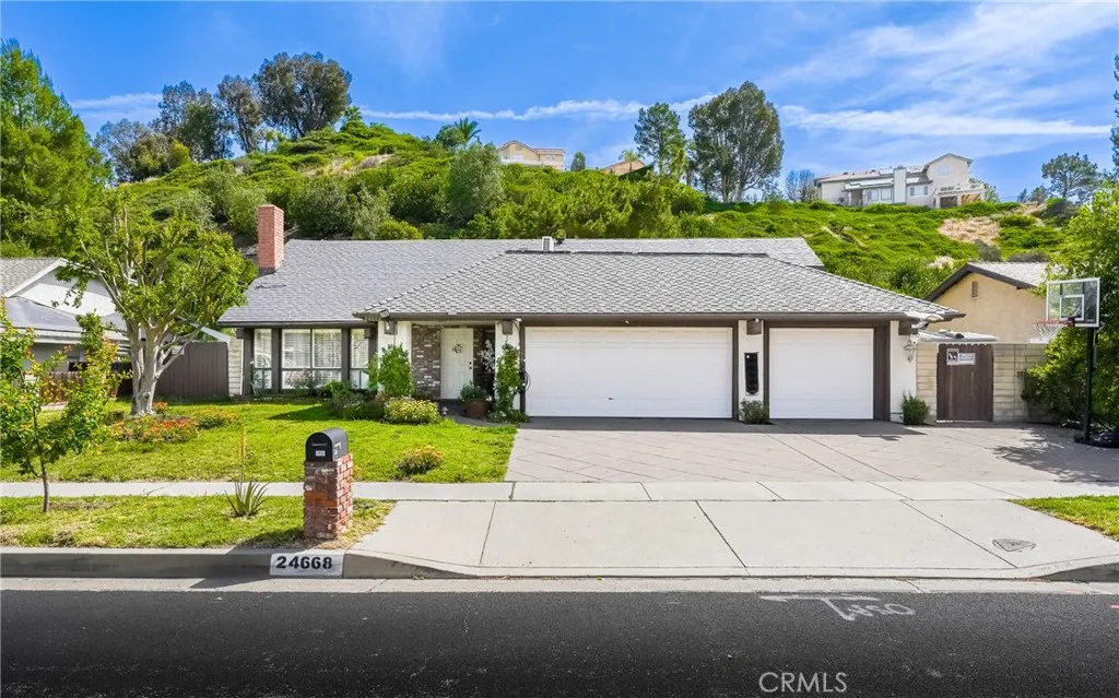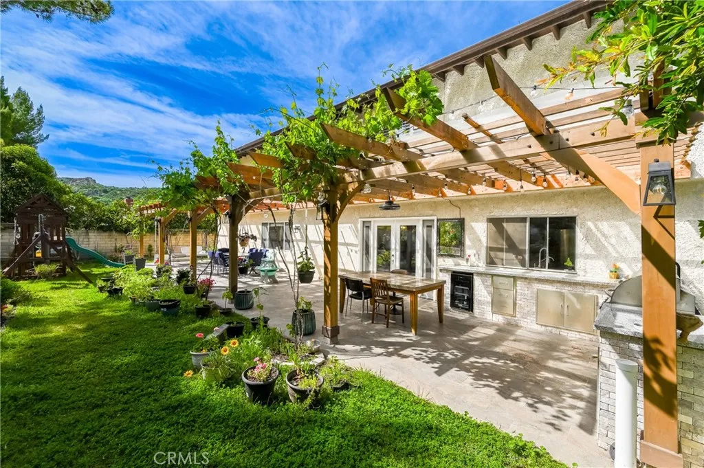 This beautifully maintained home in the heart of Happy Valley, one of Newhall’s most sought-after neighborhoods, perfectly blends architectural character with modern efficiency. The expansive living room makes a grand first impression with open-beam ceilings, a classic brick fireplace, and rich wood flooring. Culinary enthusiasts will love the remodeled chef’s kitchen, featuring granite counters, custom cabinetry, and a versatile butcher-block island/breakfast bar. Seamless indoor-outdoor living is invited through French doors leading to a nature lover’s paradise. The peaceful, private backyard features a lush garden filled with vibrant flowers and fruit trees. Entertain in style at the dedicated barbecue area, tucked under a stunning custom pergola draped in mature grapevines, providing the perfect canopy for alfresco dining and evening relaxation. The versatile floor plan continues inside with a convenient downstairs guest wing (bedroom and den), featuring a custom Murphy bed and bookshelf unit. Upstairs, find two spacious secondary bedrooms and a primary retreat boasting "his & hers" walk-in closets and a dedicated sitting area. Owned Solar, new 200A electrical panel with EV charger, copper plumbing throughout, and updated HVAC systems, and a new tankless water heater. Complete with a 3-car garage featuring a workshop/office and sink (and a vibrant, custom art mural!), all located just minutes from the 5 freeway at Calgrove Blvd. NO Mello Roos and NO HOA.