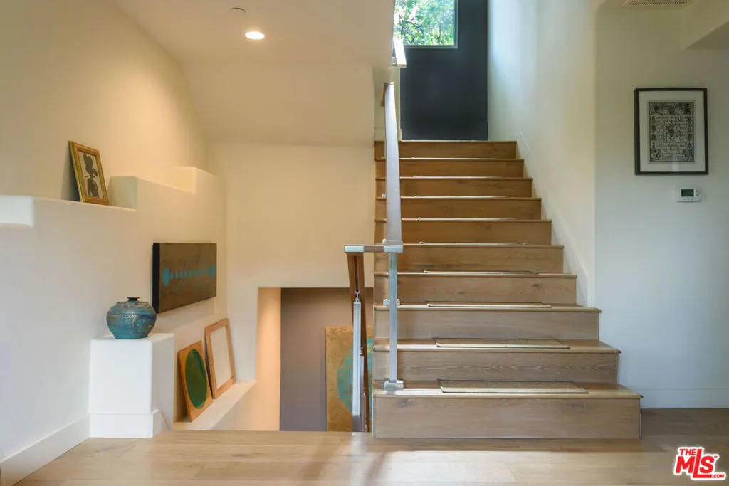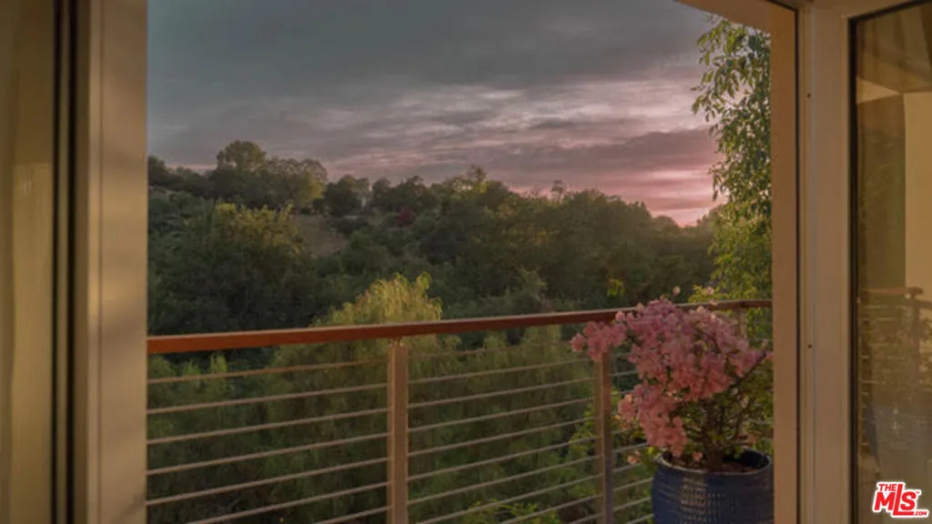 A Sanctuary Above the City! Tucked into the wooded hillsides of Woodland Hills, this thoughtfully reimagined modern Mediterranean retreat offers something increasingly rare in Los Angeles: genuine seclusion, lofty views, and the quiet drama of mature trees and open sky, all just minutes from the boutique dining and culture of Ventura Boulevard, and a breathtaking canyon drive to the coast. Renovated from the ground up by two artists, custom walnut interior doors and a wood-burning fireplace framed in elegant fluted marble tile set a tone that is warm and refined, while generous stone-look tile on the ground floor gives way to engineered oak hardwood on the levels above. Light pours through newer triple-paned windows and an extra-high sliding door that opens the living and dining spaces to the outdoors, dissolving the boundary between inside and out.The kitchen has been completely reimagined with a solid marble tile backsplash, quartz countertops, warm modern finishes, underlit cabinetry, and a generous pantry - a beautifully functional space, with a glass door opening directly to the rear patio. A discreet powder room completes the ground floor. The second level opens into a book-lined screening room, pre-wired for Dolby 5.1 and finished with custom floating cabinetry purpose-built for media - a space equally given to cinema and quiet reading. Beyond, a hallway leads to two spacious bedrooms with scenic outlooks and custom built-in closets with glass sliding doors, a full bath, and a generous laundry room with ample storage. The larger bedroom has a corner gas fireplace with a modern fire-glass bed as does the primary suite above. The stairwell opens to a sweeping picture window, drawing light through the home and framing a burst of bougainvillea as you arrive at the primary suite - reserving the entire top floor. This elevated retreat offers panoramic mountain views, its own fireplace, a Juliette balcony facing the setting sun, and custom maple ply cabinetry with generous his-and-hers walk-in closets. The spa-like primary bath features custom floating cabinetry and a soaking tub positioned to face the western light. Outside, the landscaping reflects the same artistic sensibility as the interiors. Tall walls with a cascade of lush climbing foliage frame the approach, creating a sense of verdant seclusion as you arrive at the wide front steps. Beyond, Mediterranean plantings - olive trees, fragrant herbs, drought-resilient perennials - create a garden sanctuary that feels far removed from the city below. A bespoke steel-lined fire pit and seating area anchor the rear deck, surrounded by mature plantings and the sound of birds. With convenient freeway access, it is a home for people who want to be in Los Angeles without being consumed by it.Additional features include central HVAC, recirculating hot water system, attached two-car garage with storage loft, and three exterior utility closets. This house is easy to call HOME!!!