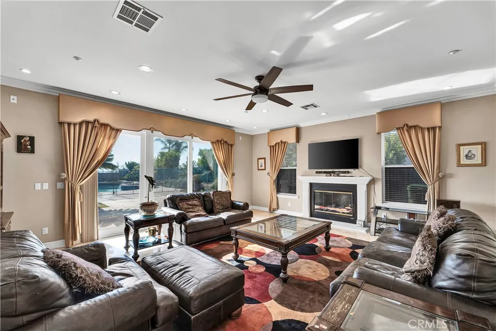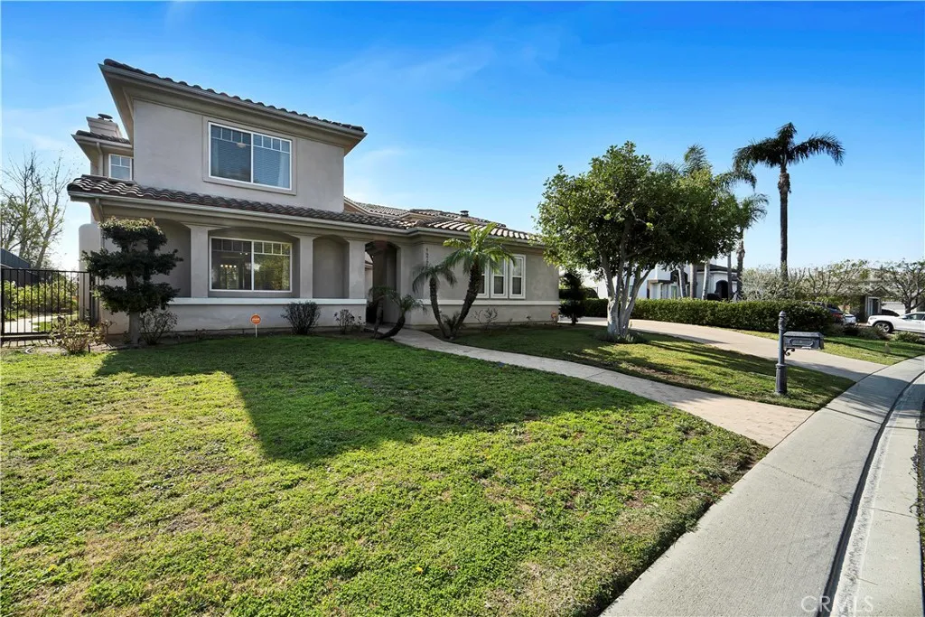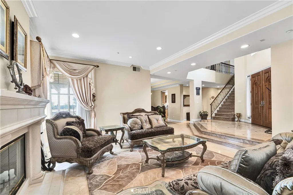 Set behind the gates of Trammell Estate, this Porter Ranch home makes an immediate impression. Enjoy panoramic mountain views and San Fernando Valley city lights stretch across the horizon, visible from both indoor and outdoor living spaces. The entry sets the tone: carved wood doors open to a two-story foyer finished in travertine that carries through the main level. A step-down living room with a fireplace and custom drapery flows into an expansive family room, while an upstairs loft offers flexible space for a media room, home office, or playroom. Five bedrooms and 5.5 baths are spread across the home, with a full guest suite conveniently located on the main floor. The kitchen is built for serious entertaining with an oversized island with a built-in sink, high-end appliances, and generous cabinetry make it as functional as it is well-appointed. Outside, the flat half-acre lot has been put to excellent use. A custom pool and spa, gazebo, fire pit, built-in BBQ, and a large covered patio surround a wide grassy lawn. A wonderful setup that works equally well for a quiet evening or a large gathering. Minutes from top-rated schools, premier shopping, fine dining, and freeway access, this is a well-located, well-appointed estate in one of the valley's most desirable communities.