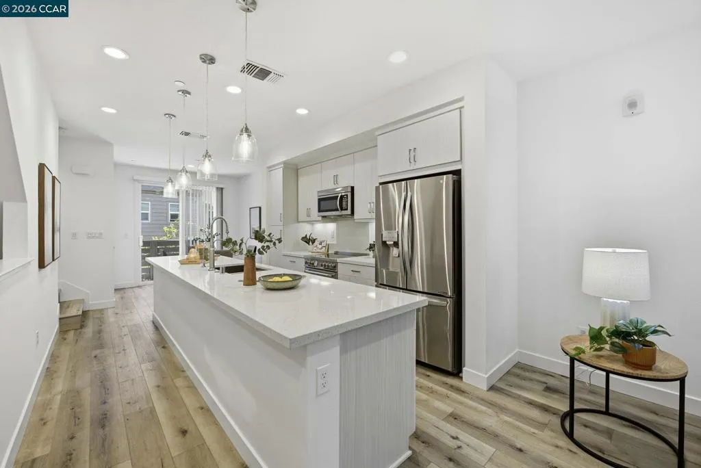Discover modern urban living in the highly desirable, gated Ice House Community! This stunning, energy-efficient and solar-powered townhouse-style condo is a commuter’s dream—just minutes from BART, major freeways, and the Transbay shuttle. Front entry is located inside the secured gate, offering added privacy not found in all units. Enjoy an open floor plan enhanced by high ceilings and expansive UV-coated windows providing abundant natural light. The upgraded chef’s kitchen showcase high-end Bertazzoni Italian stainless steel appliances, quartz countertops, soft-close cabinetry, and an oversized island ideal for both entertaining and everyday living. Designed for maximum comfort, this home features two spacious suites. The primary bedroom offers dual walk-in closets and a spa-like en-suite bathroom with double vanities and a walk-in shower with bench seating. The second bedroom also includes its own en-suite bathroom, providing excellent privacy for family or guests. Additional highlights include owned solar panels, a Ring doorbell, and a tri-level Nest thermostat. Don’t miss this opportunity to make this beautiful home your own!