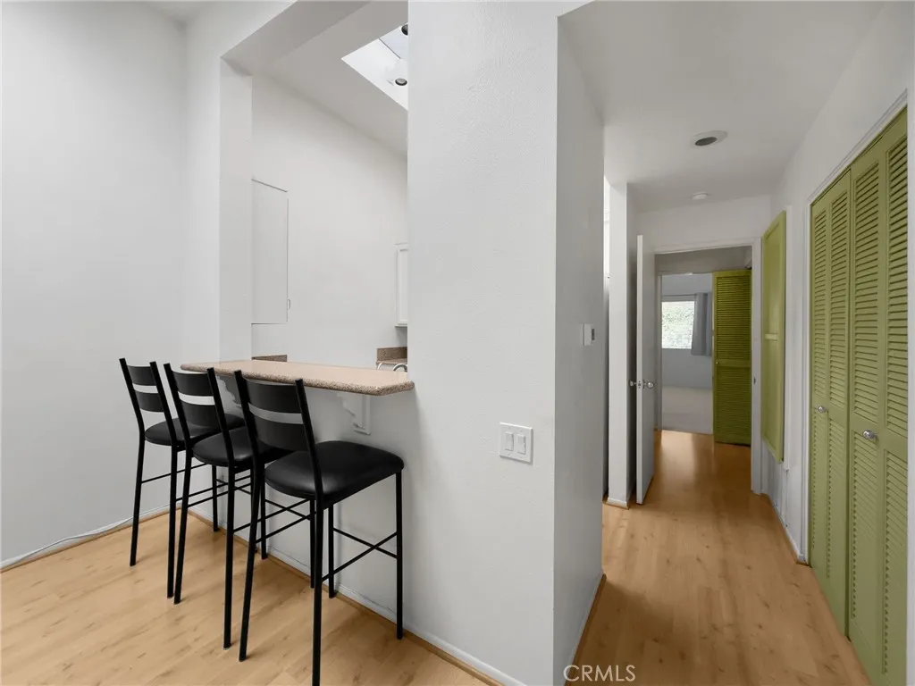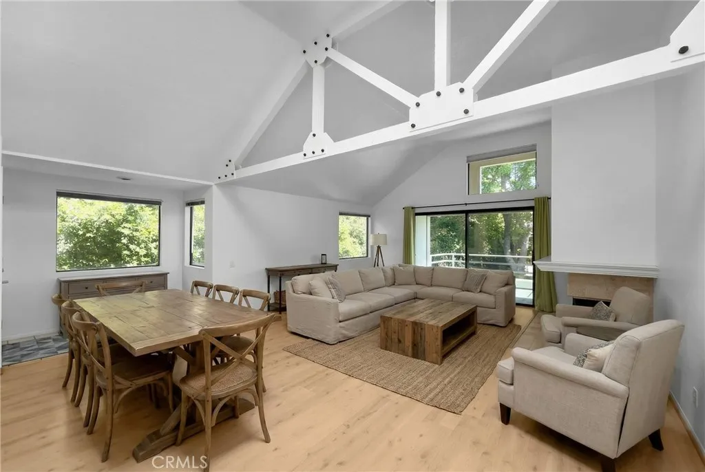Welcome to this light-filled and inviting one-bedroom, one-bath home, nestled in a peaceful setting surrounded by mature trees. Step inside to soaring 11-foot ceilings with open beams and skylights that bring in an abundance of natural light, creating a bright and uplifting space you’ll love coming home to. The cozy living room features a fireplace and opens to a private balcony—perfect for relaxing and enjoying the outdoors. The kitchen offers white cabinetry, granite countertops, and plenty of storage, flowing easily into the dining area with bar seating and its own skylight, making everyday living and entertaining feel effortless. The spacious primary bedroom is a true retreat, featuring high ceilings and a large closet that provides ample storage. Warm bamboo flooring, in-unit laundry with full size washer and dryer with additional storage, inside storage closet and a private deck storage closet. This home blends comfort, charm, and convenience beautifully offering a space that truly feels like home the moment you walk in. Includes a 1-car garage and ample guest parking. Close to parks, shopping, restaurants and El Modena Wilderness area. Your own private retreat in the highly desirable Villeurbanne community of Orange. Hurry, won't last!