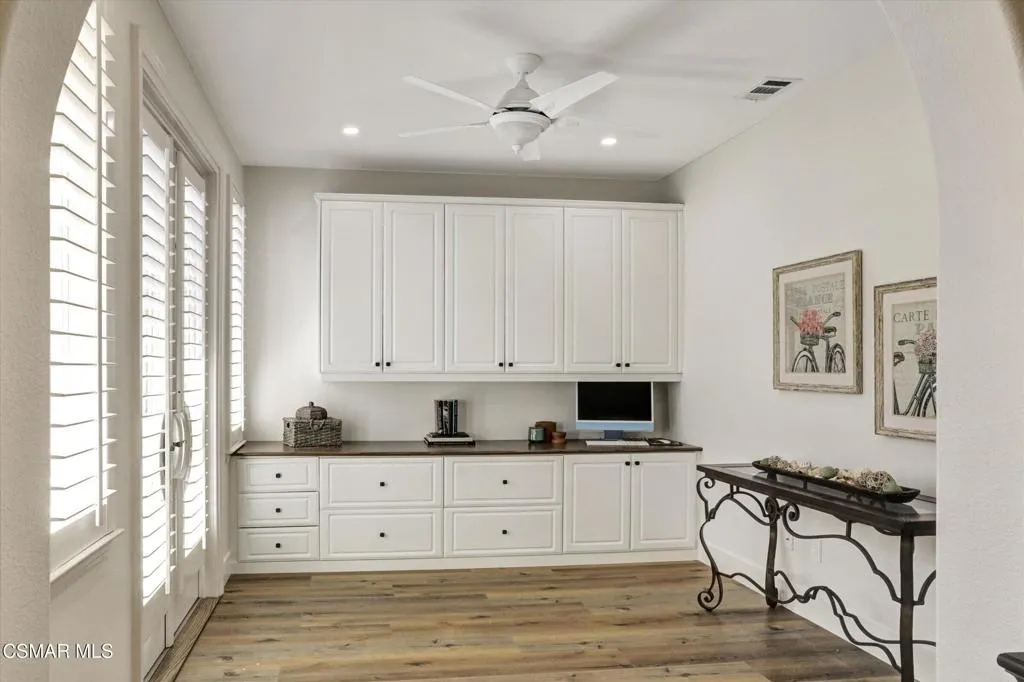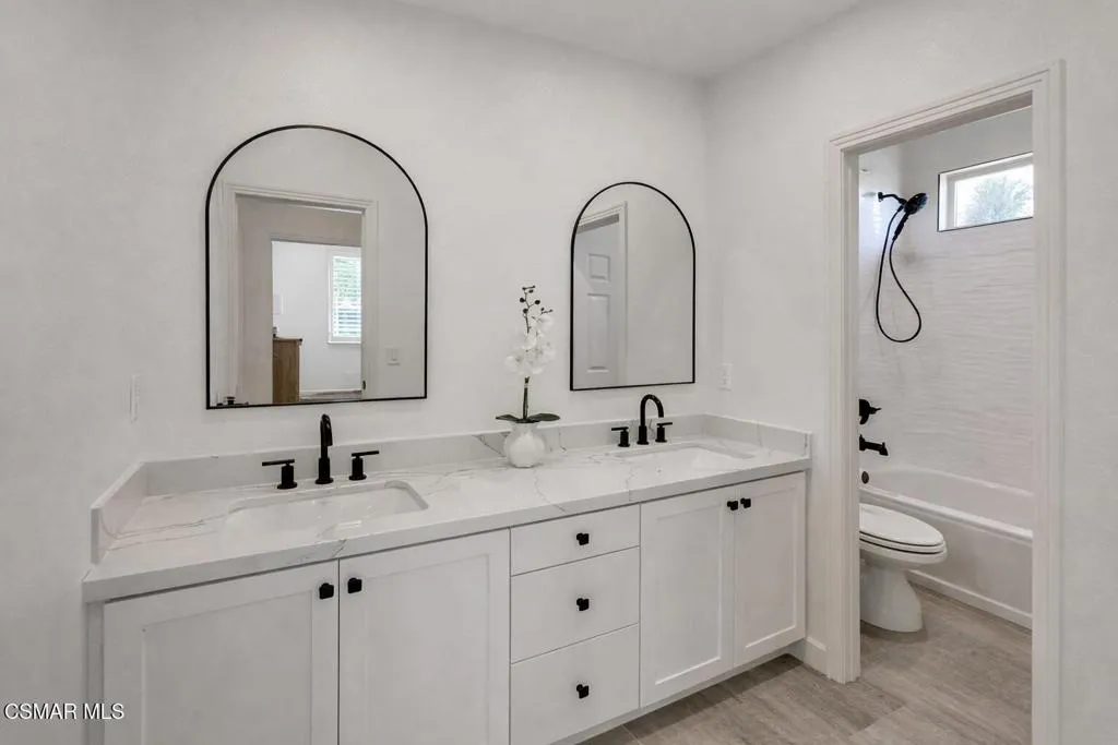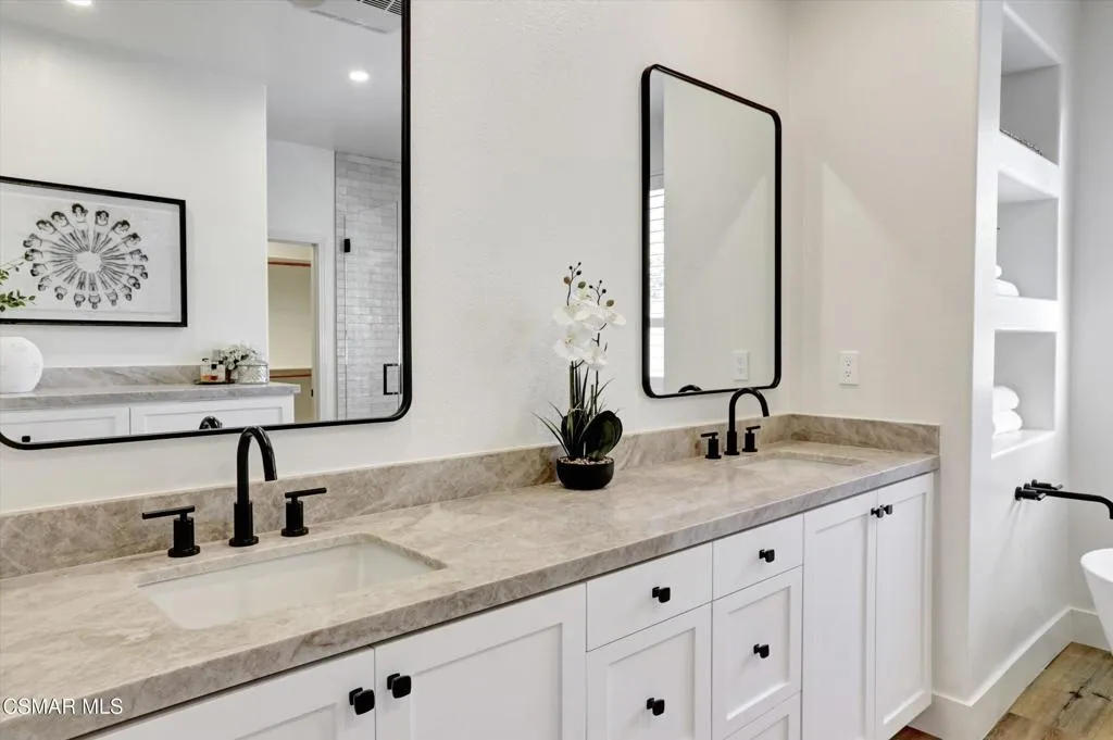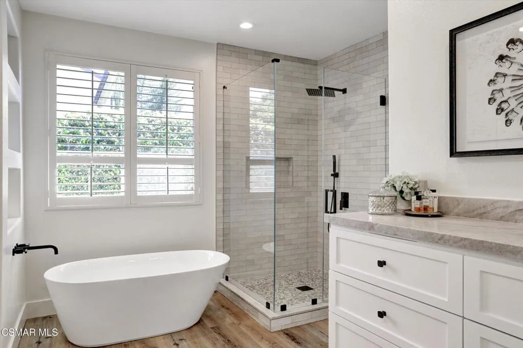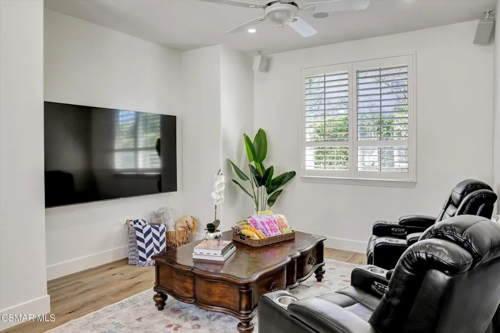 Welcome to this beautifully reimagined single-story home, where modern design meets everyday comfort in one of Simi Valley's most desirable neighborhoods. Thoughtfully remodeled throughout, this residence offers a seamless blend of style, functionality, and indoor-outdoor living.Inside, the home features three bedrooms (possible fourth), a welcoming family room with fireplace and custom built-ins, new wide-plank flooring, abundant natural light, and an open-concept layout ideal for both daily living and entertaining. The stunning chef's kitchen serves as the heart of the home, showcasing custom white cabinetry, new quartz countertops, stainless steel appliances, a large center island, and a full-height backsplash with under-cabinet lighting--perfect for gathering and hosting.Retreat to the beautifully upgraded primary suite, complete with a spa-inspired bathroom featuring a walk-in glass shower, modern tilework, dual vanities, a walk-in closet, and a freestanding soaking tub--creating a true luxury experience at home.A standout feature is the dedicated media/flex room, ideal for movie nights, a home office, gym, or additional living space, offering the versatility today's buyers are seeking.Step outside to a private backyard designed for relaxation and entertaining. Enjoy a covered patio for dining, an expansive seating area, and a custom fire pit set against a peaceful, landscaped backdrop. The yard offers a rare combination of usable space, fruit trees, privacy, views, and scenic surroundings--perfect for indoor-outdoor California living.Additional highlights include remodeled secondary bathrooms, recessed lighting throughout, plantation shutters, custom storage, and an upgraded spacious three-car garage.This turnkey home delivers the perfect blend of luxury, lifestyle, and location