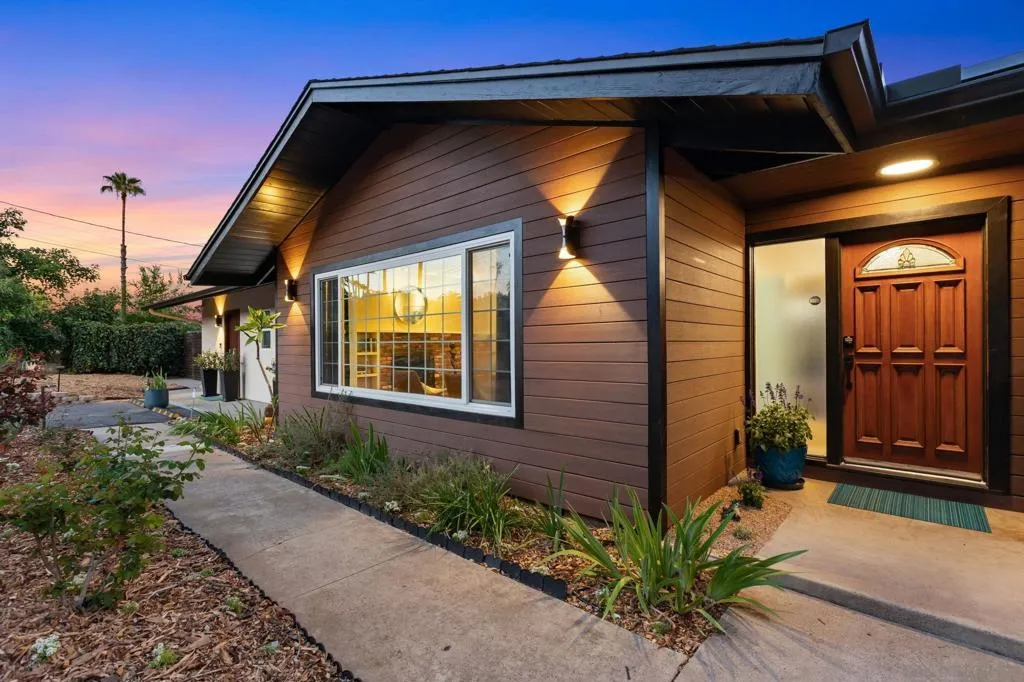 Stunning midcentury masterpiece, thoughtfully designed and set on a 1/2 acre lot with sweeping east-facing views. California indoor-outdoor living at its finest with this remodeled 5-bedroom, 3.5 bath estate. The main home features 4 bedrooms, 2.5 baths and a pool—and there’s nothing “junior” about the attached Junior ADU, a 1-bedroom/1-bathroom unit with a separate entrance and a full kitchen, offering the ultimate in flexible multi-generational living or potential for passive income. At the heart of this home is a chef's kitchen that will stop you in your tracks. Light oak cabinetry, cream-color quartz countertops with a waterfall edge, and a dramatic seafoam blue ceramic tile backsplash set the stage, while premium appliances—including an induction range—make cooking a genuine pleasure. An expansive peninsula with wine storage and barstools anchors the open-concept space, flowing naturally into the dining area and family room, an effortless setting for everything from casual mornings to memorable dinner parties. The Junior ADU (JADU) is nothing short of exceptional, from its rich mahogany pocket doors to its private patio and a complement of full-size appliances. Thoughtfully designed to maximize the space, this relaxing retreat offers its own full kitchen that includes an induction range and quartz countertops; a grasscloth-accented bedroom that opens to a private, gated patio; and an elegantly arranged bathroom with teak and marble accents, a huge spa-style shower, and a full-size LG WashTower wash/dryer. The JADU has earned a coveted spot in the Top 1% of Airbnb listings, having attained “Guest Favorite” status and consistently maintaining an impressive occupancy rate—a testament to its quality, design and guest appeal. Whether you continue to use it as a high-performing Airbnb mid-term rental, transition to a long-term tenant, or welcome extended family, the income potential here is as impressive as the space itself. Meander outside and discover a backyard with mountain views that rivals any resort. The lushly landscaped area surrounding the pool and patio offers a rare sense of seclusion, perfect for afternoon swims, al fresco dining, and unforgettable evenings under the Southern California sky. Mature fruit and nut trees create a setting that is as beautiful as it is functional. With a half-acre lot providing ample space, there is exciting potential to add a second ADU, further maximizing long-term value and versatility in one of California's most in-demand housing markets. A single-story layout spanning four bedrooms and 2.5 baths, the main residence blends midcentury charm with a mix of original vintage character and modern updates at every turn. Water-resistant wood-based laminate flooring throughout offers warmth and beauty plus everyday durability. The formal living room welcomes you with built-in bookshelves and a classic brick fireplace. The adjacent great room features east-facing mountain views and sliding glass doors that keep the interior light and bright and connect to the pool area and landscape beyond. A dedicated laundry room/butler’s pantry with butcher block herringbone counter and exposed brick adds convenience with character. An adjacent powder room—on the other side of a mahogany pocket door—features a solid teakwood vanity with Carrara marble top, and retro tile flooring. Leased solar keeps energy costs in check, city water and sewer lines add convenience, and the prime Escondido location puts you minutes from the charm of historic downtown, North County's wine country, scenic hiking trails, and easy freeway access to the greater San Diego metro area. Five bedrooms total. Two distinct living spaces. One extraordinary property.