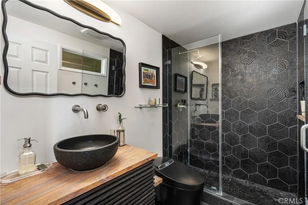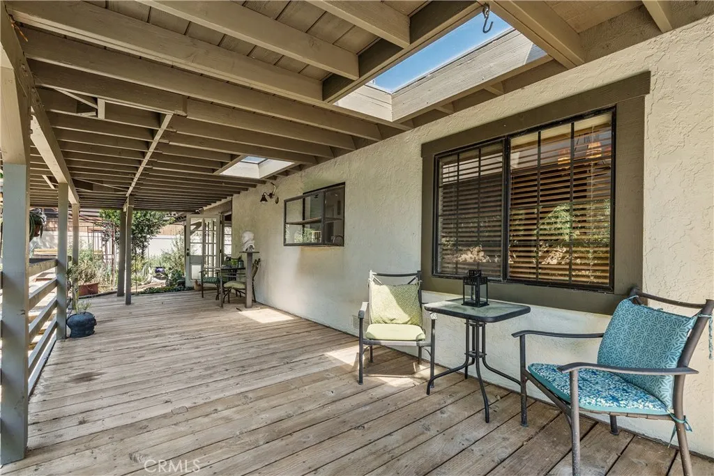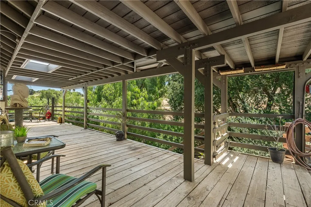 Experience tranquil hillside living in this beautifully updated two-story home nestled in the highly coveted community of Chatsworth Lake Manor, a neighborhood where properties seldom become available. Surrounded by rugged natural beauty, this inviting residence blends charm, character, and inspiring views into a warm and welcoming retreat. The home features vaulted and beamed ceilings, abundant natural light, and an effortless indoor-outdoor flow. The spacious great room opens to a wrap-around balcony and expansive deck, offering sweeping views of the surrounding hillsides—an ideal setting for morning coffee, evening sunsets, or gatherings under the stars. The remodeled kitchen showcases modern finishes, newer appliances, including wine refrigerator, and a unique chalkboard wall that adds both charm and functionality, plus beautiful Italian "Golden Lightning" granite. Just off the kitchen, a fully enclosed light-filled patio which has been transformed into a versatile studio—perfect for artists, remote work, or quiet contemplation. The first-floor primary bedroom offers convenience and privacy with an adjacent updated bathroom(2024) with bidet, while the second floor includes two additional bedrooms with high ceilings, and recently renovated bathroom (2025). Additional updates include a newer roof (2022), central air and heat, and a relaxing spa installed in 2021. A spacious driveway provides plentiful parking without the restrictions of an HOA. Outdoors, mature trees, including avocado, nectarine, Meyer lemon and orange trees, water-wise plants, brick-lined garden beds, and a calming koi pond create a serene environment that invites relaxation and interaction with nature. Located only minutes from shopping, dining, schools, and city conveniences, this home offers the rare combination of peaceful country living with easy access to everything you need. Known as “Mini-Topanga,” Chatsworth Lake Manor is beloved for its creative energy, natural surroundings, and long-term residents who treasure its quiet charm. Homes here are rarely offered—and even more rarely with this level of care, character, and view-filled outdoor space. Discover a one-of-a-kind retreat ideal for nature lovers, creatives, or anyone seeking a peaceful escape just moments from the bustle of the city.