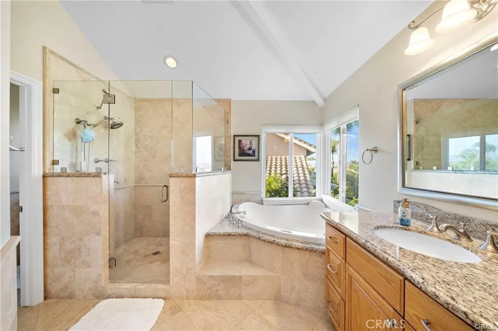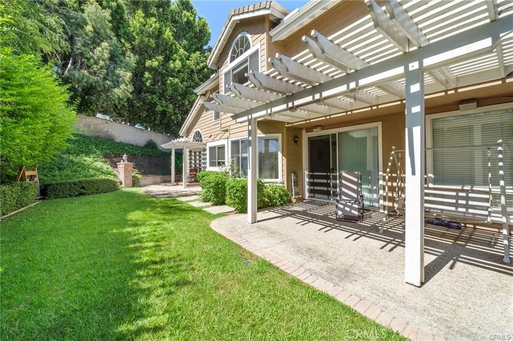 Nestled in the prestigious Belmont Estates community, this beautifully updated 5-bedroom, 3-bathroom residence offers over 3,300 square feet of refined living space. A formal tiled entry leads to a spacious living room with a stately fireplace and an elegant dining room ideal for entertaining. The expansive family room with a brick fireplace and wet bar opens to a well-appointed kitchen featuring granite countertops, double ovens, a center island, and a sunny dining nook overlooking the lush backyard. A desirable main-level bedroom and full bath provide the perfect setup for guests or multi-generational living. Upstairs, the grand primary suite features a walk-in closet, dual vanities with granite countertops, an oversized walk-in shower, and a relaxing Jacuzzi tub with city light views. Two additional bedrooms share a well-sized bath with dual sinks and a tub/shower combination. A large upstairs bonus room offers flexible space for a media room, playroom, or home office. The beautifully landscaped backyard features two covered patios and mature greenery, ideal for outdoor entertaining. Additional highlights include a spacious indoor laundry room with sink and cabinetry and brand-new carpet throughout. Located in the hills of Orange, this home combines comfort, space, and timeless appeal in a highly sought-after gated enclave. Furniture is staging only.