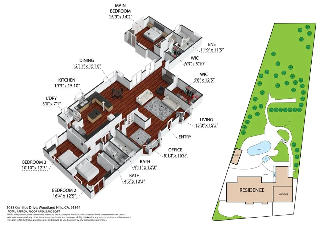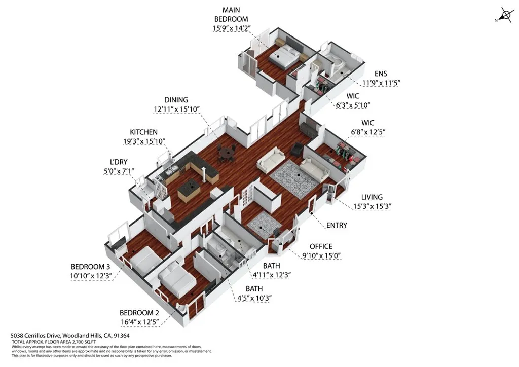 3BD+ OFFICE + DET BONUS OFFFICE. South of the Boulevard on a quiet cul-de-sac, this light-filled home delivers sweeping Valley views from nearly every room. Featuring wood beam ceilings and an open-concept layout, the home offers a warm, mid-century modern vibe with endless potential to make it your own. The primary suite is thoughtfully positioned on its own wing, showcasing stunning north-facing views, an en suite bath, and generous storage. Two additional bedrooms sit on the opposite side of the home—one with its own en suite—plus a flexible office that can easily be enclosed for added privacy. Step outside and the backyard truly steals the show. Take in breathtaking Valley views, enjoy a sparkling pool, built-in BBQ, and multiple spaces to entertain. On the Fourth of July, you’ll have a front-row seat to the Warner Center fireworks. An additional detached bonus office with its own private entrance adds versatility for work or guests. Rarely does a house like this come on the market. Pool, Views and grassy area. Minutes from shopping and entertainment in both Woodland Hills and Calabasas. Don’t miss it.