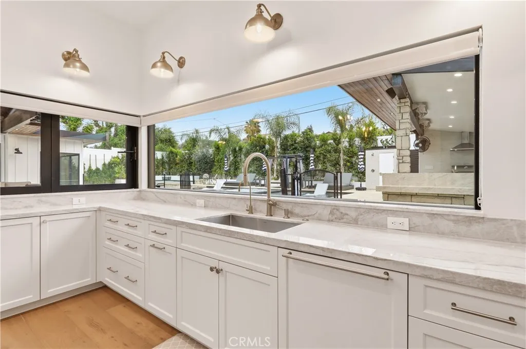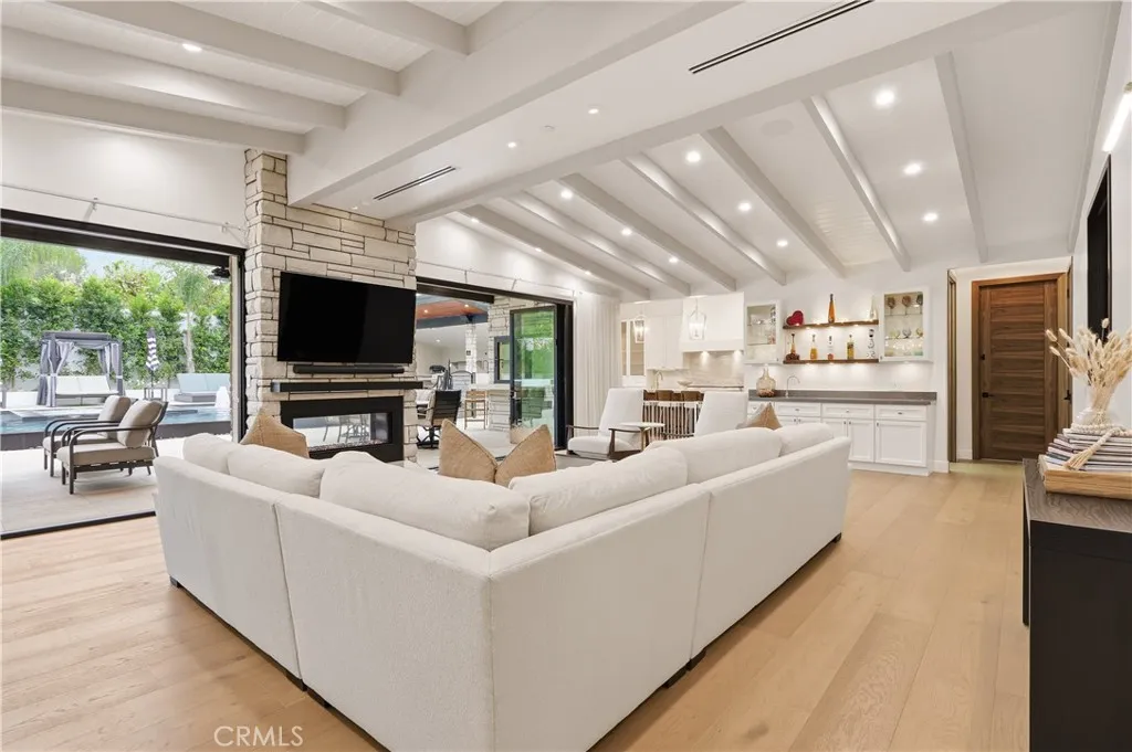 Welcome to a fully remodeled, single-story modern farmhouse–style home offering a refined blend of luxury, privacy, and seamless indoor-outdoor living. Set behind automated gates, 10-foot privacy walls, and mature ficus hedging, this property provides exceptional tranquility paired with high-end design and modern amenities throughout. At the center, a designer kitchen featuring top-tier Thermador appliances, paneled refrigerator and freezer columns, two dishwashers, and a microwave drawer. A striking 60-Inch Wolf Double Oven Range anchors the space, complemented by Taj Mahal quartzite countertops with waterfall edges and a full-height backsplash. Custom cabinetry with European gold mesh accents, brushed gold fixtures, and bespoke hardware elevate the aesthetic, while Fleetwood picture and bifold windows flood the space with natural light to create a seamless indoor-outdoor connection. The open-concept living room blends comfort and sophistication with exposed ceiling beams, automated sheer curtains, and a sleek see-through glass fireplace. Oversized La Cantina bifold doors fully open to the backyard, blurring the lines between indoors & out. A custom bar with illuminated shelving and glass cabinetry completes the space, ideal for entertaining. The primary suite is a private retreat with high ceilings, a grand entry, and pool views. Automated blackout and sheer curtains provide privacy & natural light options. The spa-inspired bath features a freestanding soaking tub, glass-enclosed steam shower, dual vanities, and a private water closet. The spacious walk-in closet provides ample storage space throughout. Each additional bedroom is en-suite, including a junior primary with pool views and a corner suite with a jetted tub. Vaulted ceilings, wainscoting, and designer lighting enhance each of the 5 bedrooms & baths. The resort-style backyard showcases a negative-edge pool with Baja shelves, a spillover spa, and full automation. A covered outdoor kitchen with premium appliances, patio heaters, and a dining area allow for year-round enjoyment. A fire pit, outdoor powder room, and low-maintenance landscaping complete the space. Additional features include Lutron smart lighting, integrated security, dual HVAC’s, 2 water filtration system, audio & ethernet wiring, a 2-car high-ceiling insulated garage with epoxy floors, EV charging, & attic storage. Soaring ceilings, eight-foot walnut doors, & designer finishes complete this turnkey luxury home!