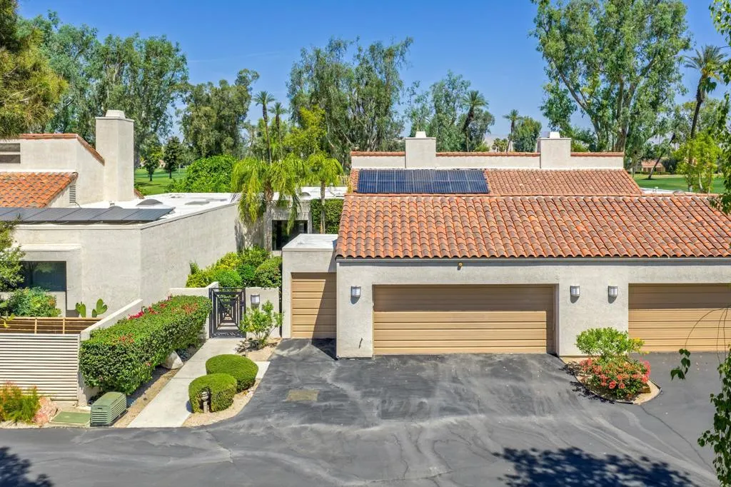 This beautifully maintained condo home located within the highly sought-after guard-gated Mission Hills Country Club, offering exceptional amenities including three private golf courses, 27 tennis courts, pools, spas, a premier fitness center, and optional golf, tennis, and social memberships. Enter the lovely private courtyard with tranquil fountain and room to relax. The main no-step living area is both dramatic and inviting, highlighted by a vaulted wood-beam ceiling, ceramic tiled flooring, bar with beverage refrigerator, gas fireplace, and open sightlines that frame the panoramic golf course views. The main bedroom suite is a serene retreat with breathtaking picture window with serene views and direct access to the terrace. The updated bath has double vanities, and good closet space Generous guest bedrooms one of which is used as convertible den with walk-in closet and access to patio.Offered furnished per inventory, making it ready for immediate enjoyment. Also, included is leased solar system of $90.84 month so rarely get an electric bill.The attached two-car garage plus a dedicated golf cart garage offers convenience and is lined with huge closets, loads of storage. Additionally, a generous parking area is nearby for guests. The land lease has been extended to 2121, providing long-term peace of mind. HOA includes 3-guard gated security entrances, Internet, Cable TV, roof maintenance, exterior painting of structure and patio walls, landscaping, common area maintenance, lake maintenance, trash, and choice of several community pools and spas nearby! A rare offering for full-time living or an unforgettable seasonal retreat or seasonal rental income opportunity.