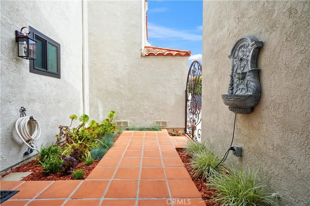 Beautifully remodeled coastal retreat in the prestigious, gated Las Fuentes community of Huntington Harbour. This 3-bedroom, 2.5-bath home features soaring 10-foot ceilings, new dual-pane windows (2022), upgraded electrical panel, and premium waterproof laminate/vinyl flooring throughout. The updated kitchen offers quartz countertops, stainless steel appliances, a built-in microwave, full-size refrigerator, dishwasher, and wine fridge, plus a cozy breakfast nook and direct access to the attached two-car garage. The open layout flows into a dining area with fireplace and sliding doors leading to a private patio with lush landscaping, lemon and lime trees, and a gas BBQ—perfect for outdoor living. Upstairs, the spacious primary suite includes vaulted ceilings, a private balcony, sitting area, a walk-in closet, dual vanities, and an upgraded walk-in shower. Two additional bedrooms share a balcony and a fully remodeled bath April 2026, with convenient upstairs laundry. Additional features include a remodeled powder room, ample storage, a water purifier, Levelor blinds, new front entry hardscape, and recent termite and stucco work. Enjoy added privacy with no rear neighbor. Community amenities include a pool, sauna, and beautifully maintained grounds. Ideally located near Huntington Harbour Mall, local dining, shops, and just minutes from the water for kayaking, paddleboarding, and beach days, with easy access to top schools, parks, freeways, and Long Beach Airport.