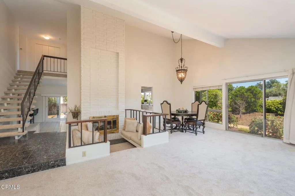 This Classic 1966 Two story home in Thousand Oaks has been beautifully refreshed, blending its original architectural character with clean, modern updates. With 2,600 Square feet of living space, the interior feels exceptionally bright and open, thanks to a fresh coat of neutral paint and brand new carpeting throughout. The home opens with a sense of drama and scale. The entry foyer leads into a spacious living room characterized by vaulted ceilings and large windows that flood the space with natural light. A standout feature is the floor-to-ceiling white brick fireplace, which serves as a sophisticated focal point. The adjacent dining area, under an elegant chandelier, offers a seamless flow for entertaining. The Kitchen maintains a crisp, 'all white' aesthetic with painted cabinetry and tile countertops. It is designed to take advantage of the 12,632-square-foot lot, featuring a large bay window over the sink and expansive wrap-around windows in the breakfast nook that offer panoramic views of the lush backyard and mature avocado, orange, and lemon trees. A short flight of stairs leads to the lower level, which is perfectly set up as an entertainer's hub with your own speakeasy. The double-sided fireplace creates a cozy atmosphere in the secondary lounge. Large sliding glass doors provide direct access to the back patio, creating your indoor-outdoor flow. The Convenient half bath featuring a modern black vanity top is the perfect powder room. The upper level provides a primary suite with vaulted ceilings and a large picture window. The en-suite bathroom includes a double vanity and a walk-in shower. The 2nd, 3rd, and 4th bedrooms have plenty of storage space and new carpet. New roof, new driveway, and exterior paint completed this year, 2026.