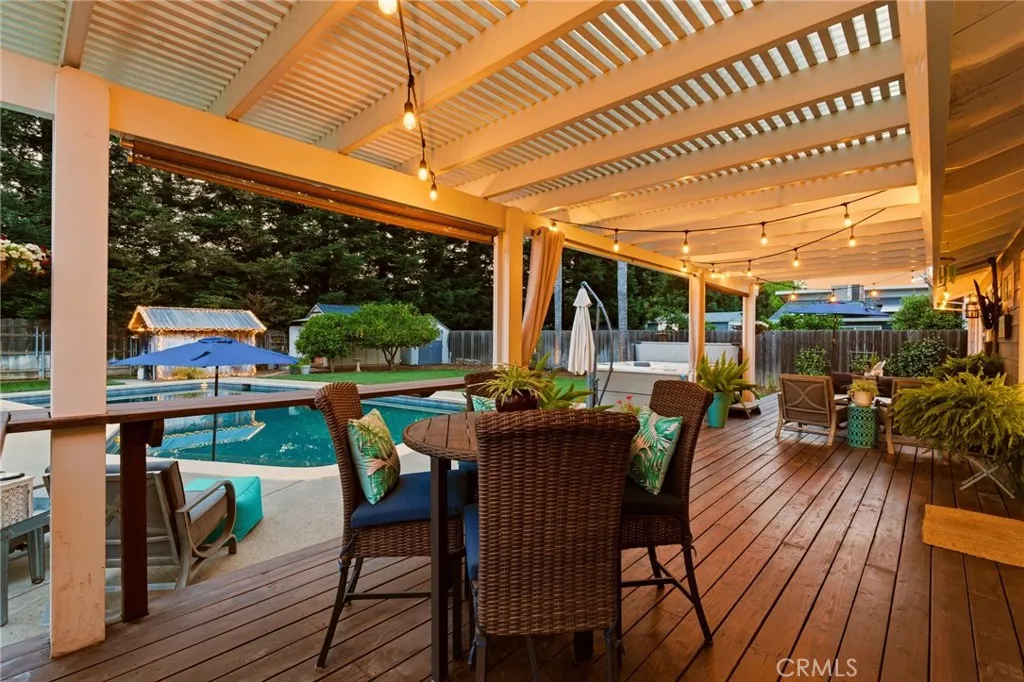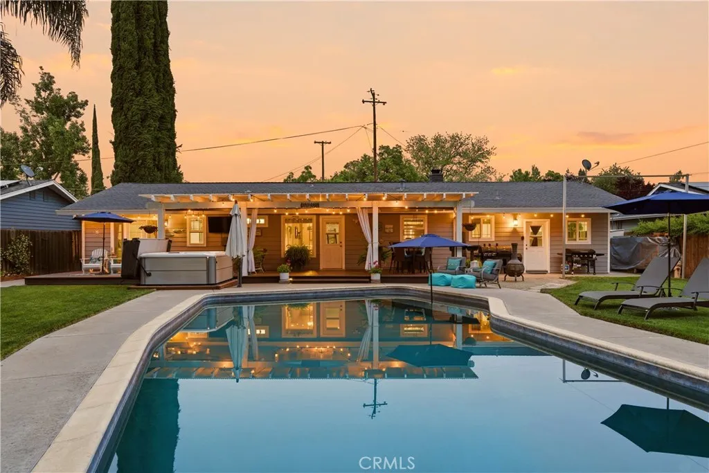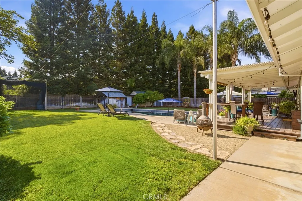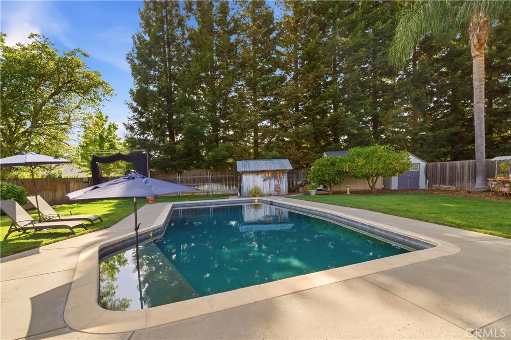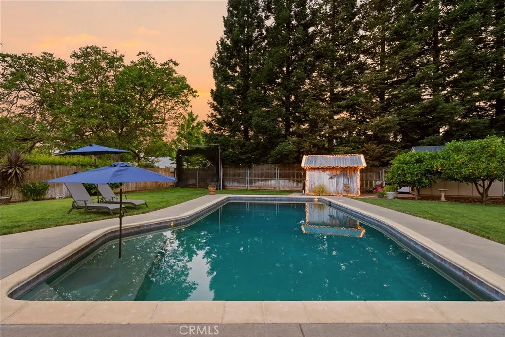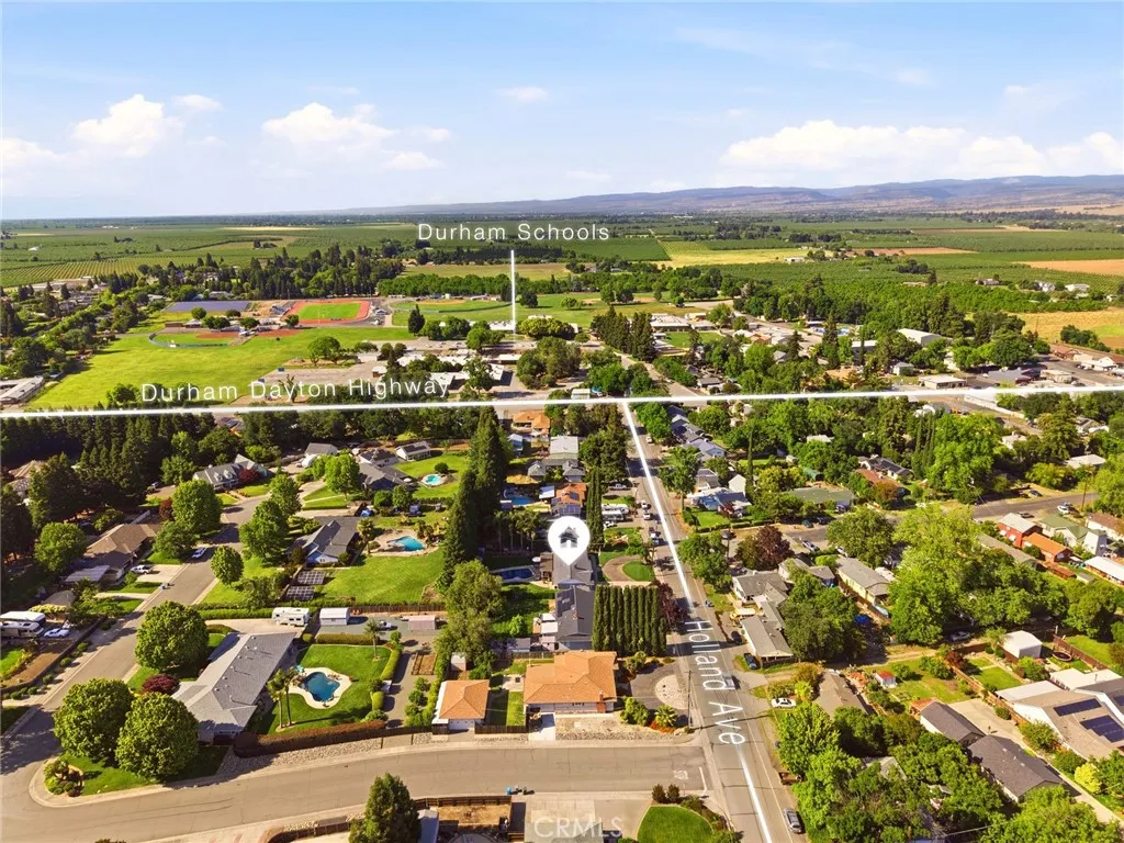 Located in the highly desirable Durham School District, this turnkey home offers charm, space, and functionality on a huge lot with plenty of parking for all your needs. Completely remodeled down to the studs in 2006, it provides peace of mind with thoughtful updates throughout. The inviting interior features 3 spacious bedrooms plus a dedicated office with built-in workspaces, perfect for working from home or added flexibility. Step outside to your own private retreat, where a sparkling in-ground pool takes center stage alongside an above-ground hot tub. The backyard is designed for both relaxation and entertaining, featuring a large wood deck with pergola, mature trees for shade and privacy, and a spacious covered patio, creating the perfect space to unwind or host gatherings year-round. Back inside, you’ll love the custom hickory wood cabinets, sleek quartz countertops, and warm bamboo wood flooring that flow throughout the home. Comfort and efficiency are covered with a newer HVAC system, whole house fan, and smart thermostat, while the kitchen is equipped with a new cookstove and new refrigerator. Additional exterior highlights include new exterior paint, a detached crafting/work shed, pool shed, updated pool equipment, automatic sprinklers, and newer rain gutters. Conveniently located close to schools and other amenities, this home truly combines comfort, functionality, and lifestyle in one exceptional package.