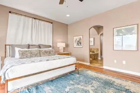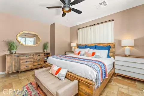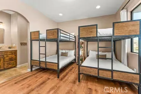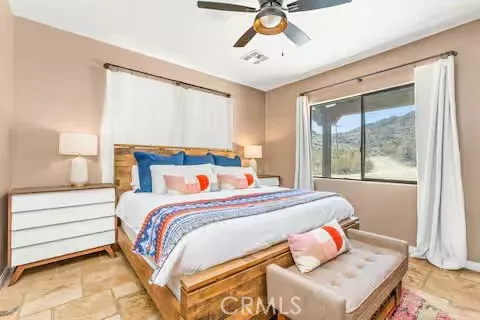 Escape to this gorgeous pool home on a generous 5 acre equestrian lot in Joshua Tree's most desirable neighborhood! Less than 3 miles from the National Park entrance, the location can't be beat. At almost 2600 square feet this spacious home enjoys sweeping views of the valley, high ceilings, and a touch of southwestern flair. Enter the home through the antique wooden door brought up from Mexico and you're greeted by custom wooden barn doors on either side of you leading to bonus rooms (originally den and dining rooms) now being used as additional bedrooms. Continue into the great room where you find a cozy family room complete with a pellet stove and reclaimed wood mantle. To your left is the dining area, and behind you the open kitchen. The kitchen features granite countertops, built in appliances, and tons of storage. Stand over your copper sink at the kitchen island and past your loved ones and onto the panoramic desert view through your sliding doors. On one side of the home you'll find a half bathroom as well as a primary bedroom en suite w/ a sliding door for more views, and a gorgeous en suite bathroom featuring a jetted spa tub, double vanity, walk-in shower, and walk-in closet. This entire suite is filled with natural light during the day and a peaceful distance from the other bedrooms at night. The other side of the home features two more bedrooms each with their own in-room vanity and a jack 'n' Jill bathroom. There is a laundry room that includes two sets of washer/dryers, cabinets, and a utility closet. The home features Central heat and air conditioning (2 units), central vacuum, ceiling fans in all rooms, and Nest thermostats. Now for the real showstopper, the outdoors! The covered back patio looks down onto your fenced and heated in-ground sparkling pool and spa. Large swinging back gates allow you to open them for a panoramic desert view from inside of the pool area as well, or turn off the interior pool/spa lights and gaze up into the starlit night sky. Off the front patio you'll find tons of parking, a large 3 car garage (currently a game room) with a built in counter and mini-fridge, and 2 OWNED extra-large propane tanks which allows you to negotiate on your propane costs. This lot also features plenty of land where previous owners enjoyed keeping horses. From copper sinks to railroad tie fence posts, this home has a truly special feel. Continue it's run as a highly successful Airbnb or make Cope Compound your very own paradise!