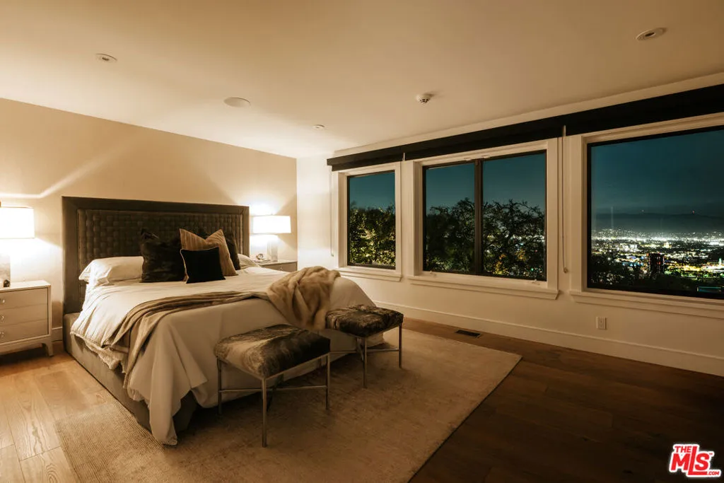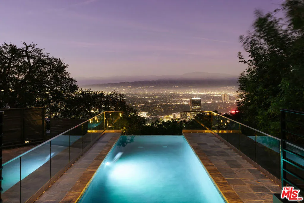 Private gated 3-bedroom home with a versatile bonus room (ideal as a 4th bedroom, office, or gym), featuring an infinity pool on a 14,810 sq ft lot with unobstructed city and mountain views. Positioned on an exclusive cul-de-sac among multi-million dollar architectural estates. Thoughtfully designed by celebrity designer Jeff Lewis, this home boasts high-end finishes and all new systems throughout. Seamless indoor-outdoor flow with expansive view windows, French doors, and an entertainer's deck. Designer kitchen with marble counters and stainless appliances, open living areas, and a primary suite with spa-like bath and walk-in closet. Grassy yard area ideal for dogs, plus a 2-car garage and gated motor court accommodating up to 8 vehicles with additional street parking available.