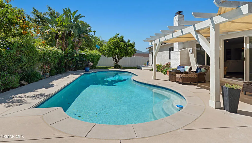 Welcome to this impeccably maintained, single-story gem nestled on a prime corner lot at the end of a quiet cul-de-sac in Newbury Park. Offering over 1,300 square feet of stylishly appointed living space, this 3-bedroom, 2-bathroom residence perfectly balances contemporary flair with a warm, ''homey'' atmosphere. The heart of the home features an expansive open floor plan anchored by a stunning ''great room.'' High-end laminate and tile flooring flow seamlessly throughout, leading you to a dramatic stone fireplace that serves as the room's centerpiece. The gourmet kitchen is a chef's delight, outfitted with smooth granite countertops, a functional center island, and premium stainless steel appliances. Experience true relaxation in the remodeled bathrooms, each boasting attractive tile-enclosed showers and designer touches. The primary suite offers a serene escape with picturesque mountain views, while dual-pane windows throughout much of the home ensure quiet and energy efficiency. A dedicated laundry room provides ample storage with ample cabinetry, and the two-car garage has been thoughtfully converted into a partial living area--perfect for a home gym, hobby room, or den. Step outside to your private paradise. The rear yard is an entertainer's dream, featuring a gorgeous sparkling pool and a variety of mature fruit trees. Whether you are hosting a summer barbecue or enjoying a quiet morning by the water, the mountain backdrop provides a stunning sense of tranquility.This turnkey masterpiece is ready for you to move in and start making memories. Schedule your private showing today!